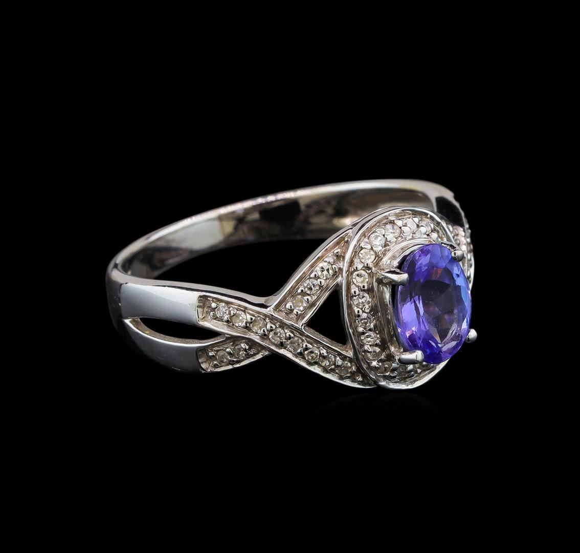 One electronically tested 14KT white gold ladies cast tanzanite and diamond ring with a bright polish finish. The featured tanzanite is set within a diamond bezel supported by intertwining diamond set shoulders, completed by a two and one-half millimeter wide band. Identified with markings of "14K". Condition is new, good workmanship. Containing: One prong set oval mixed cut natural tanzanite, measuring 7.25 x 5.25 x 3.35mm, 6%. bulge factor, approximate weight of 0.93ct., clarity is eye clean, type I, medium dark, very slightly grayish, bluish violet color, (GIA bV 6/3), cut is good. Transmitting light with no distortion, transparent. Graded in the setting. Tanzanite is a very rare gemstone that is only found in the country of Tanzania. Originally discovered in 1967. Tiffany & Company, named the stone Tanzanite. It is found in the Usumburu Mountains that border the Umba Valley of northern Tanzania. Tanzanite occurs in gray, brown, violet, blue, reddish-purple, & green. The gem is interesting because of its exceptional pleochroism. Rotated in different directions a tanzanite will exhibit multiple changes of color. Tanzanite has a low tolerance to ultrasonic cleaning, and should not be cleaned using this method. Forty-Six prong set single cut diamonds, measuring 1.10 - 1.00 x 0.63mm (depth est.) approximate total weight of 46 Stones = 0.24ct. Graded in the setting. Clarity: I-1 to I-2. Color: G - I. Total Weight of Colored Stones 0.93ct. Total Weight of Diamonds 0.24ct. Total Weight of Ring 3.76 grams. AIG Appraised.