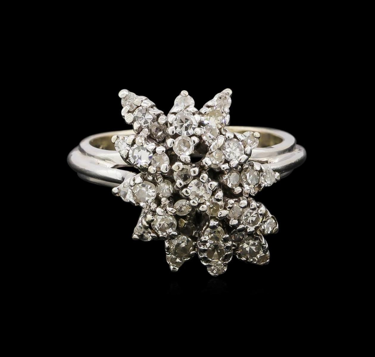 One electronically tested 14KT white gold ladies cast diamond ring with a bright polish finish. The ring features an stylized floral cluster, completed by a grooved two and one-half millimeter wide band. Identified with markings of "14K". Condition is good. Containing: Thirteen prong set single cut diamonds, measuring 2.20 - 2.10 x 1.29mm (depth est.) approximate total weight of 13 Stones = 0.50ct. Graded in the setting. Clarity: SI-1 to I-1. Color: H - J Twenty-Six prong set single cut diamonds, measuring 1.70 - 1.60 x 0.99mm (depth est.) approximate total weight of 26 Stones = 0.45ct. Graded in the setting. Clarity: SI-1 to I-1. Color: H - J. Total Weight of Diamonds 0.95ct. Total Weight of Ring 6.79 grams. AIG Appraised at $2,955.00.