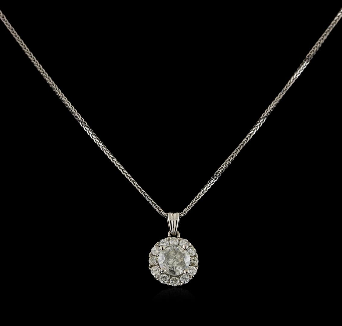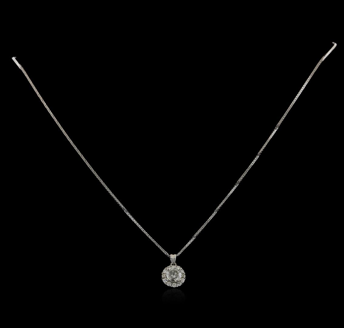 One electronically tested 14KT white gold ladies combination cast & assembled diamond pendant & chain 18.0" long, medium fancy cable with a lobster claw clasp with a bright polish finish. Identified with markings of "14K". Condition is new. Containing: One prong set round brilliant cut diamond, measuring 5.77 - 5.76 x 3.45mm (depth est.) approximate weight of 0.70ct. Clarity: I-3. Color: G, Cut is Good. Twelve prong set round brilliant cut diamonds, measuring 1.80 - 1.80 x 1.08mm (depth est.) approximate total weight of 12 Stones = 0.26ct. Clarity: SI-2 to I-2. Color: H - I, Cut is Good. All diamonds are graded in the mounting, unless otherwise stated. Total Weight of Diamonds 0.96ct. Total Weight of Pendant & Chain 2.70 grams. GGL Appraised at $3,375.00.