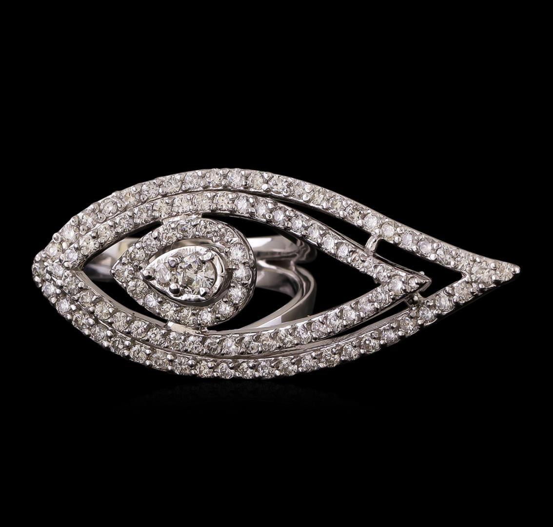One electronically tested 14KT white gold ladies cast diamond ring with a bright polish finish. Identified with markings of "K14". Condition is new. Containing: One prong set round brilliant cut diamond, measuring 2.80 - 2.80 x 1.68mm (depth est.) approximate weight of 0.08ct. Clarity: I-1. Color: I, Cut is Good. One Hundred Twelve prong set round brilliant cut diamonds, measuring 1.50 - 1.10 x 0.78mm (depth est.) approximate total weight of 112 Stones = 0.90ct. Clarity: I-1 to I-2. Color: I - J, Cut is Good. All diamonds are graded in the mounting, unless otherwise stated. Total Weight of Diamonds 0.98ct. Total Weight of Ring 5.80 grams. GGL Appraised.