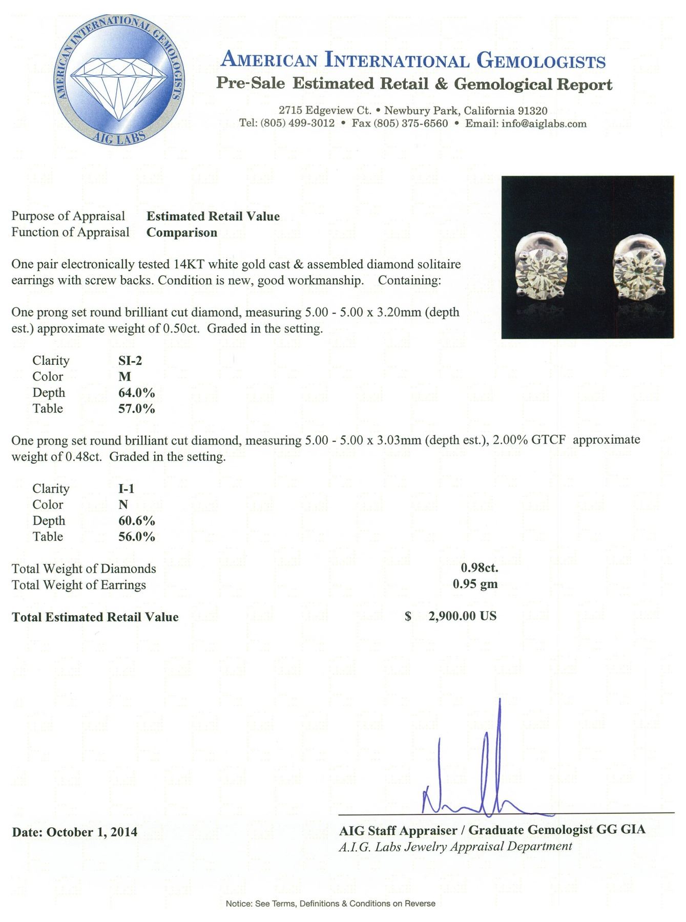 One pair electronically tested 14KT white gold cast & assembled diamond solitaire earrings with screw backs. Condition is new, good workmanship. Containing: One prong set round brilliant cut diamond, measuring 5.00 - 5.00 x 3.20mm (depth est.) approximate weight of 0.50 ct. Graded in the setting. Clarity: SI-2. Color: M. Depth 64.0%. Table 57.0%. One prong set round brilliant cut diamond, measuring 5.00 - 5.00 x 3.03mm (depth est.), 2.00% GTCF approximate weight of 0.48ct. Graded in the setting. Clarity: I-1. Color: 60.6%. Table 56.0%. Total Weight of Diamonds 0.98ct. Total Weight of Earrings 0.95 grams. AIG Appraised.