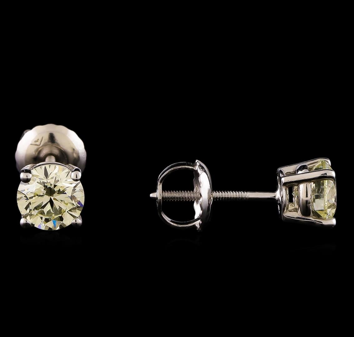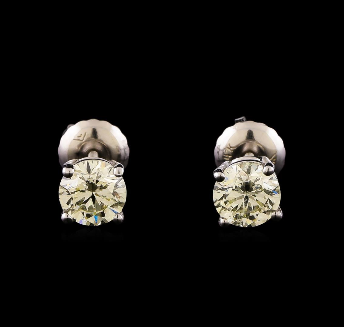 One pair electronically tested 14KT white gold cast & assembled diamond solitaire earrings with screw backs. Condition is new, good workmanship. Containing: One prong set round brilliant cut diamond, measuring 5.00 - 5.00 x 3.20mm (depth est.) approximate weight of 0.50 ct. Graded in the setting. Clarity: SI-2. Color: M. Depth 64.0%. Table 57.0%. One prong set round brilliant cut diamond, measuring 5.00 - 5.00 x 3.03mm (depth est.), 2.00% GTCF approximate weight of 0.48ct. Graded in the setting. Clarity: I-1. Color: 60.6%. Table 56.0%. Total Weight of Diamonds 0.98ct. Total Weight of Earrings 0.95 grams. AIG Appraised.