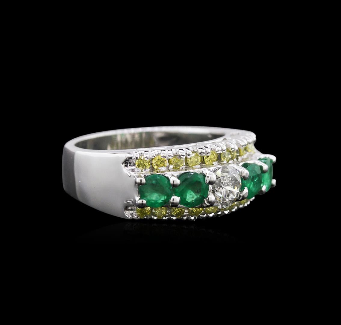 One electronically tested 14KT white gold ladies cast emerald and diamond ring with a bright polish finish. Identified with markings of "14K". Condition is new. Containing: Four prong set round modified brilliant cut natural emeralds, measuring 3.80 - 3.80 x 2.47 mm, approximate total weight of 0.98ct., clarity is heavily included, type III, medium light, very slightly grayish, green color, (GIA G 4/3), cut is good. One prong set round brilliant cut diamond, measuring 4.80 - 4.80 x 2.88mm (depth est.) approximate weight of 0.45ct. Clarity: I-2. Color: J, Cut is Good. Eighteen prong set round brilliant cut diamonds, measuring 1.80 - 1.80 x 1.08mm (depth est.) approximate total weight of 18 Stones = 0.35ct. Clarity: SI-2 to I-1, Cut is Good. Color of the stones has been treated. Colored gemstones are presumed to have been subjected to commonly used enhancement processes. All diamonds and colored gemstones are graded in the mounting, unless otherwise stated. Total Weight of Colored Stones 0.98ct. Total Weight of Diamonds 0.80 ct. Total Weight of Ring 7.60 grams. GGL Appraised.