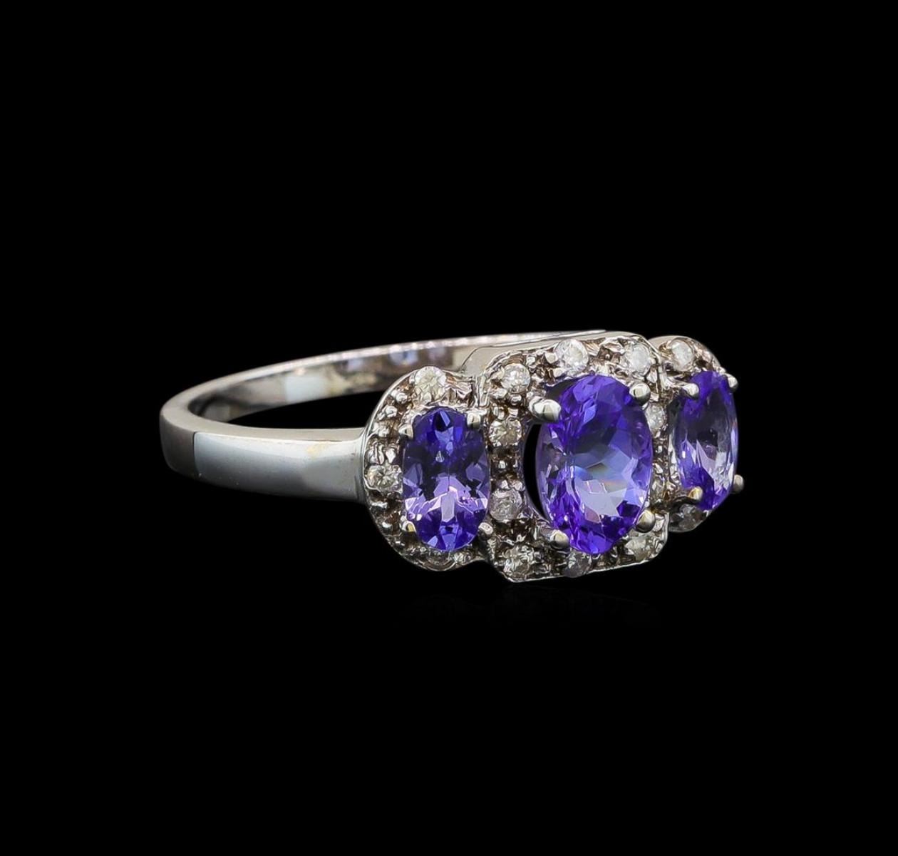 One electronically tested 14KT white gold ladies cast tanzanite and diamond ring with a bright polish finish. Identified with markings of "14K". Condition is new. Containing: One prong set oval modified brilliant cut natural tanzanite, measuring 6.40 x 4.50 x 2.93mm, approximate weight of 0.59ct., clarity is eye clean, type I, medium light, slightly grayish, violet color, (GIA V 4/2), cut is good. Two prong set oval modified brilliant cut natural tanzanites, measuring 4.90 x 3.00 x 1.95mm, approximate total weight of 0.40ct., clarity is eye clean, type I, medium light, slightly grayish, violet color, (GIA V 4/2), cut is good. Sixteen prong set round brilliant cut diamonds, measuring 1.30 - 1.30 x 0.78mm (depth est.) approximate total weight of 16 Stones = 0.13ct. Clarity: I-1 to I-2. Color: I - J. Colored gemstones are presumed to have been subjected to commonly used enhancement processes. Colored gemstones are presumed to have been subjected to commonly used enhancement processes. All diamonds and colored gemstones are graded in the mounting, unless otherwise stated. All diamonds and colored gemstones are graded in the mounting, unless otherwise stated. Total Weight of Colored Stones 0.99ct. Total Weight of Diamonds 0.13ct. Total Weight of Ring 3.30 grams. GGL Appraised at $1,670.00.