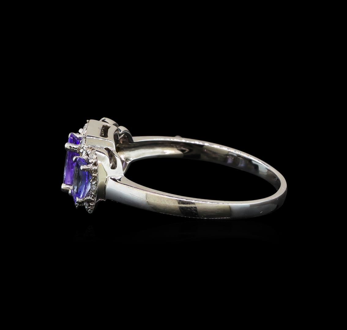 One electronically tested 14KT white gold ladies cast tanzanite and diamond ring with a bright polish finish. Identified with markings of "14K". Condition is new. Containing: One prong set oval modified brilliant cut natural tanzanite, measuring 6.40 x 4.50 x 2.93mm, approximate weight of 0.59ct., clarity is eye clean, type I, medium light, slightly grayish, violet color, (GIA V 4/2), cut is good. Two prong set oval modified brilliant cut natural tanzanites, measuring 4.90 x 3.00 x 1.95mm, approximate total weight of 0.40 ct., clarity is eye clean, type I, medium light, slightly grayish, violet color, (GIA V 4/2), cut is good. Sixteen prong set round brilliant cut diamonds, measuring 1.30 - 1.30 x 0.78mm (depth est.) approximate total weight of 16 Stones = 0.13ct. Clarity: I-1 to I-2. Color: I - J. Colored gemstones are presumed to have been subjected to commonly used enhancement processes. Colored gemstones are presumed to have been subjected to commonly used enhancement processes. All diamonds and colored gemstones are graded in the mounting, unless otherwise stated. All diamonds and colored gemstones are graded in the mounting, unless otherwise stated. Total Weight of Colored Stones 0.99ct. Total Weight of Diamonds 0.13ct. Total Weight of Ring 3.30 grams. GGL Appraised.