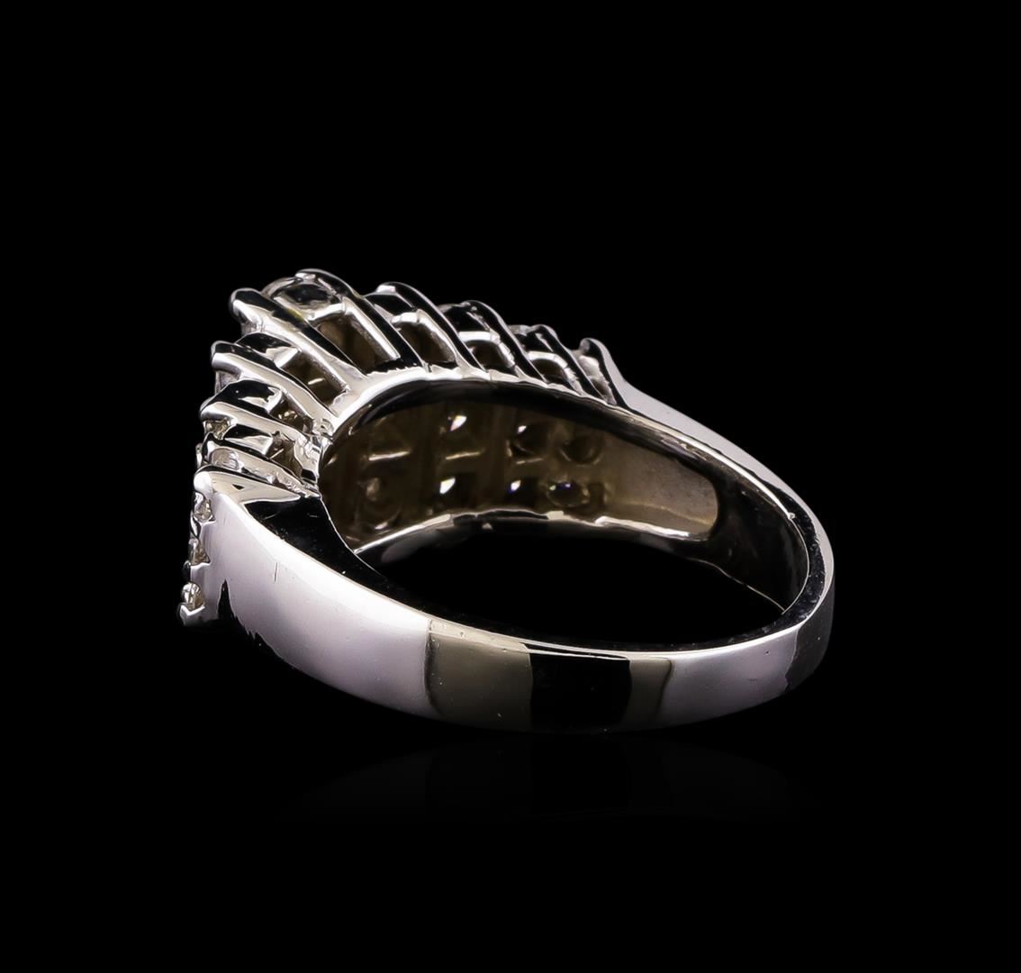 One electronically tested 14KT white gold ladies cast diamond ring with a flat shank with a bright polish finish. Identified with markings of "14K". Condition is new. Containing: Three prong set round brilliant cut diamonds, measuring 3.00 - 3.00 x 1.80mm (depth est.) approximate total weight of 3 Stones = 0.30ct. Clarity: SI-2 to I-1. Color: I - J, Cut is Good. Twenty-Four prong set round brilliant cut diamonds, measuring 2.50 - 1.50 x 1.20mm (depth est.) approximate total weight of 24 Stones = 0.70ct. Clarity: SI-1 to SI-2. Color: I - J, Cut is Good. All diamonds are graded in the mounting, unless otherwise stated. Total Weight of Diamonds 1.00ct. Total Weight of Ring 6.70 grams. GGL Appraised.