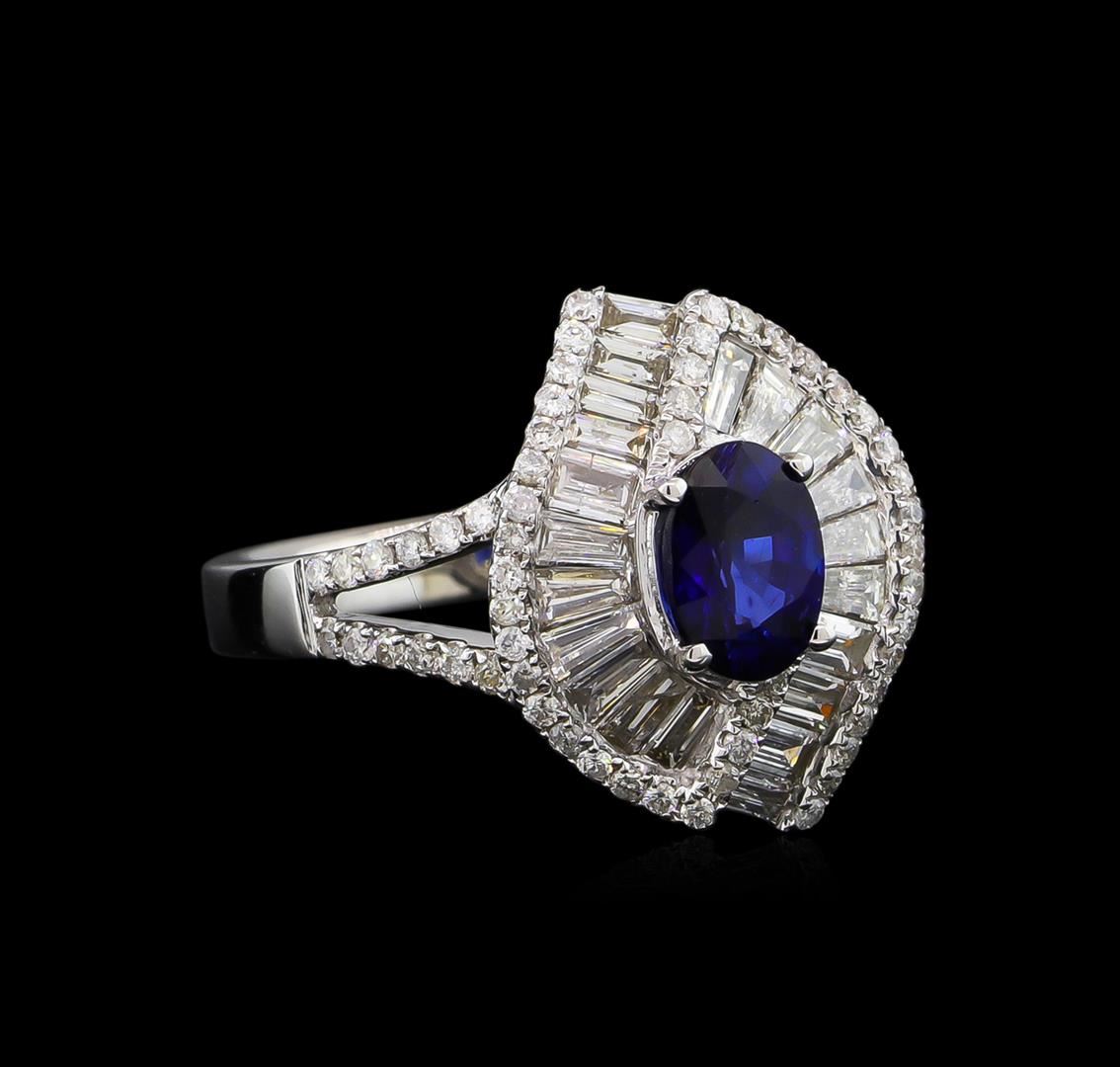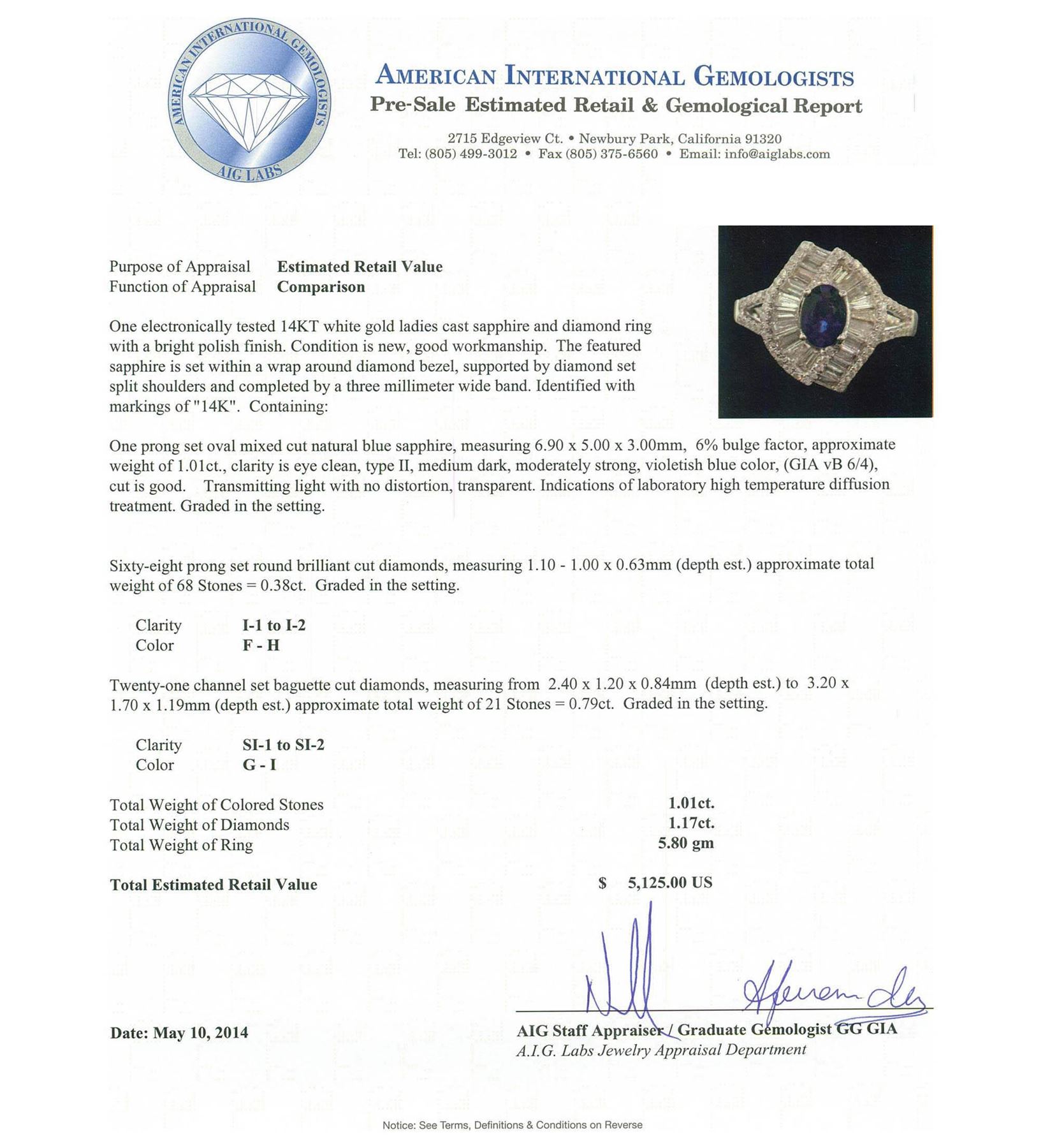 One electronically tested 14KT white gold ladies cast sapphire and diamond ring with a bright polish finish. Condition is new, good workmanship. The featured sapphire is set within a wrap around diamond bezel, supported by diamond set split shoulders and completed by a three millimeter wide band. Identified with markings of "14K". Containing: One prong set oval mixed cut natural blue sapphire, measuring 6.90 x 5.00 x 3.00mm, 6%. bulge factor, approximate weight of 1.01ct., clarity is eye clean, type II, medium dark, moderately strong, violetish blue color, (GIA vB 6/4), cut is good. Transmitting light with no distortion, transparent. Indications of laboratory high temperature diffusion treatment. Graded in the setting. Sixty-Eight prong set round brilliant cut diamonds, measuring 1.10 - 1.00 x 0.63mm (depth est.) approximate. Total Weight of 68 Stones = 0.38ct. Graded in the setting. Clarity: I-1 to I-2. Color: F - H Twenty-One channel set baguette cut diamonds, measuring from 2.40 x 1.20 x 0.84mm (depth est.) to 3.20 x 1.70 x 1.19mm (depth est.) approximate. Total Weight of 21 Stones = 0.79ct. Graded in the setting. Clarity: SI-1 to SI-2. Color: G - I. Total Weight of Colored Stones 1.01ct. Total Weight of Diamonds 1.17ct. Total Weight of Ring 5.80grams. AIG Appraised.