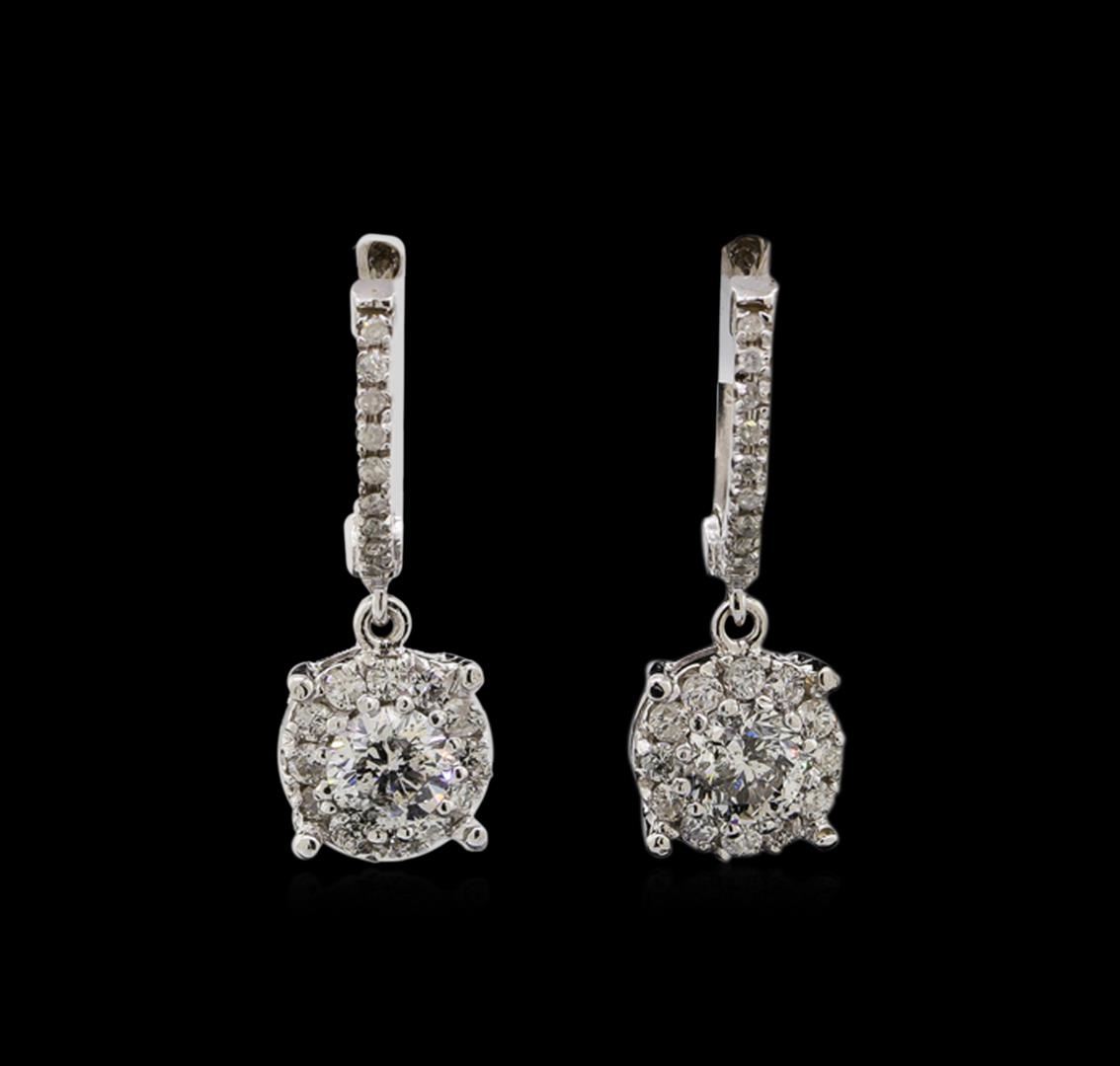 One pair electronically tested 14KT white gold ladies cast diamond earrings with hinged clip backs with a bright polish finish. Identified with markings of "14K". Condition is new. Containing: Two prong set round brilliant cut diamonds, measuring 5.00 - 5.00 x 3.00mm (depth est.) approximate total weight of 2 Stones = 0.92ct. Clarity: I-1 to I-2. Color: H - I, Cut is Good. Twenty-Four prong set round brilliant cut diamonds, measuring 1.10 - 1.10 x 0.66mm (depth est.) approximate total weight of 24 Stones = 0.12ct. Clarity: SI-2 to I-2. Color: H - I, Cut is Good. All diamonds are graded in the mounting, unless otherwise stated. Total Weight of Diamonds 1.03ct. Total Weight of Earrings 3.80 grams. GGL Appraised.