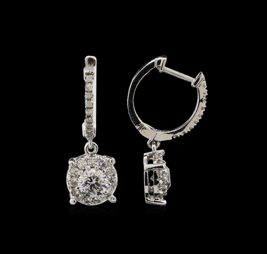 One pair electronically tested 14KT white gold ladies cast diamond earrings with hinged clip backs with a bright polish finish. Identified with markings of "14K". Condition is new. Containing: Two prong set round brilliant cut diamonds, measuring 5.00 - 5.00 x 3.00mm (depth est.) approximate total weight of 2 Stones = 0.92ct. Clarity: I-1 to I-2. Color: H - I, Cut is Good. Twenty-Four prong set round brilliant cut diamonds, measuring 1.10 - 1.10 x 0.66mm (depth est.) approximate total weight of 24 Stones = 0.12ct. Clarity: SI-2 to I-2. Color: H - I, Cut is Good. All diamonds are graded in the mounting, unless otherwise stated. Total Weight of Diamonds 1.03ct. Total Weight of Earrings 3.80 grams. GGL Appraised.