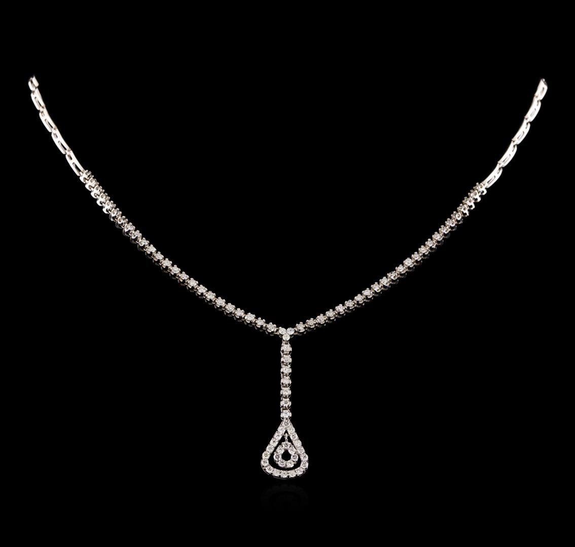 One electronically tested 14KT white gold ladies combination cast & assembled diamond necklace with a hidden box clasp with safety closer with a bright polish finish. Measurements: 17.50 in length. Identified with markings of 14K. Condition is new. Containing: Eighty-Four prong set round brilliant cut diamonds, measuring 1.50 - 1.50 x 0.90mm (depth est.) approximate total weight of 84 Stones = 1.03ct. Clarity: SI-1 to I-1. Color: H - J, Cut is Good. All diamonds are graded in the mounting, unless otherwise stated. Total Weight of Diamonds 1.03ct. Total Weight of Necklace 21.30 grams. GGL Appraised at $8,240.00.