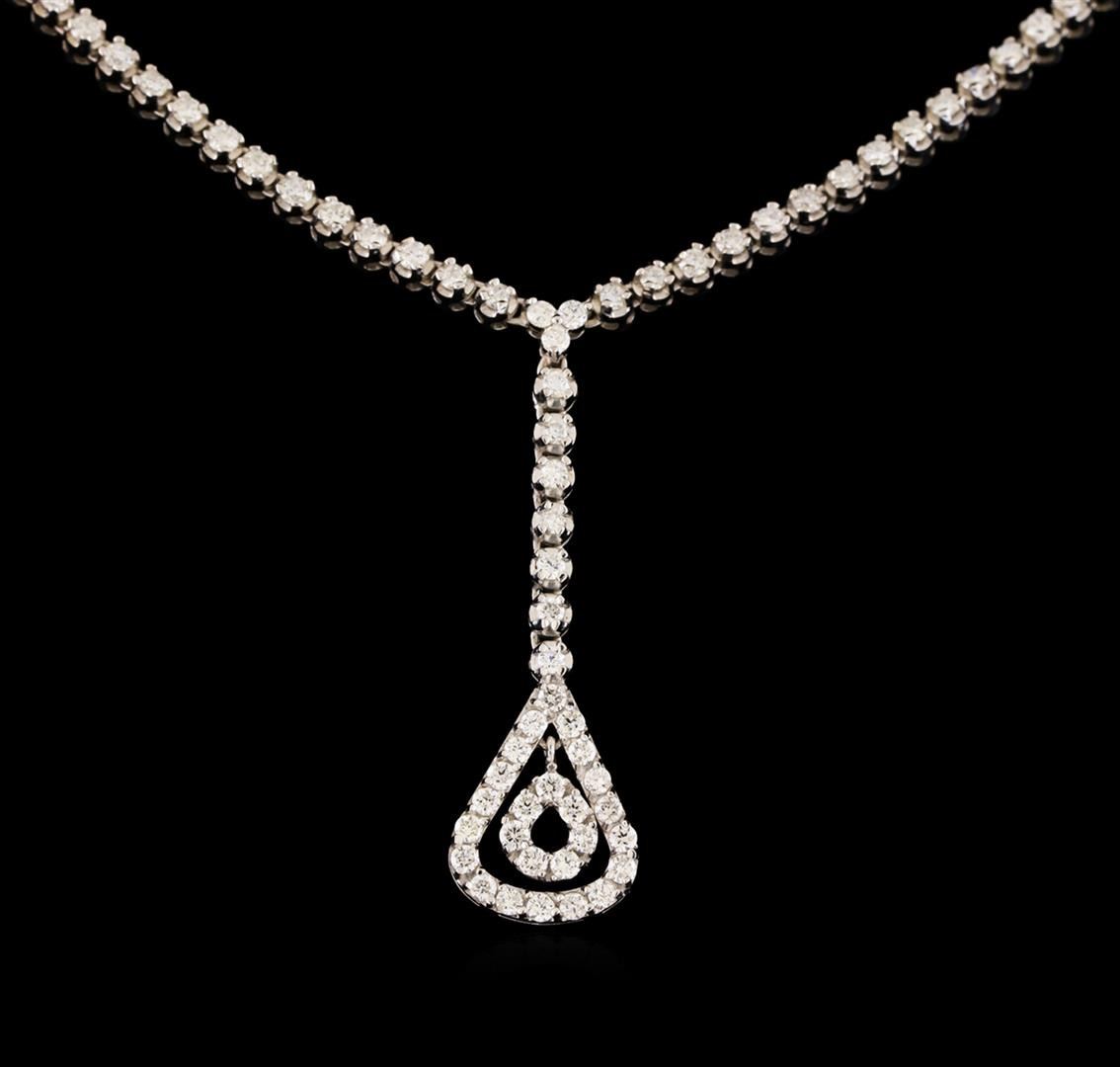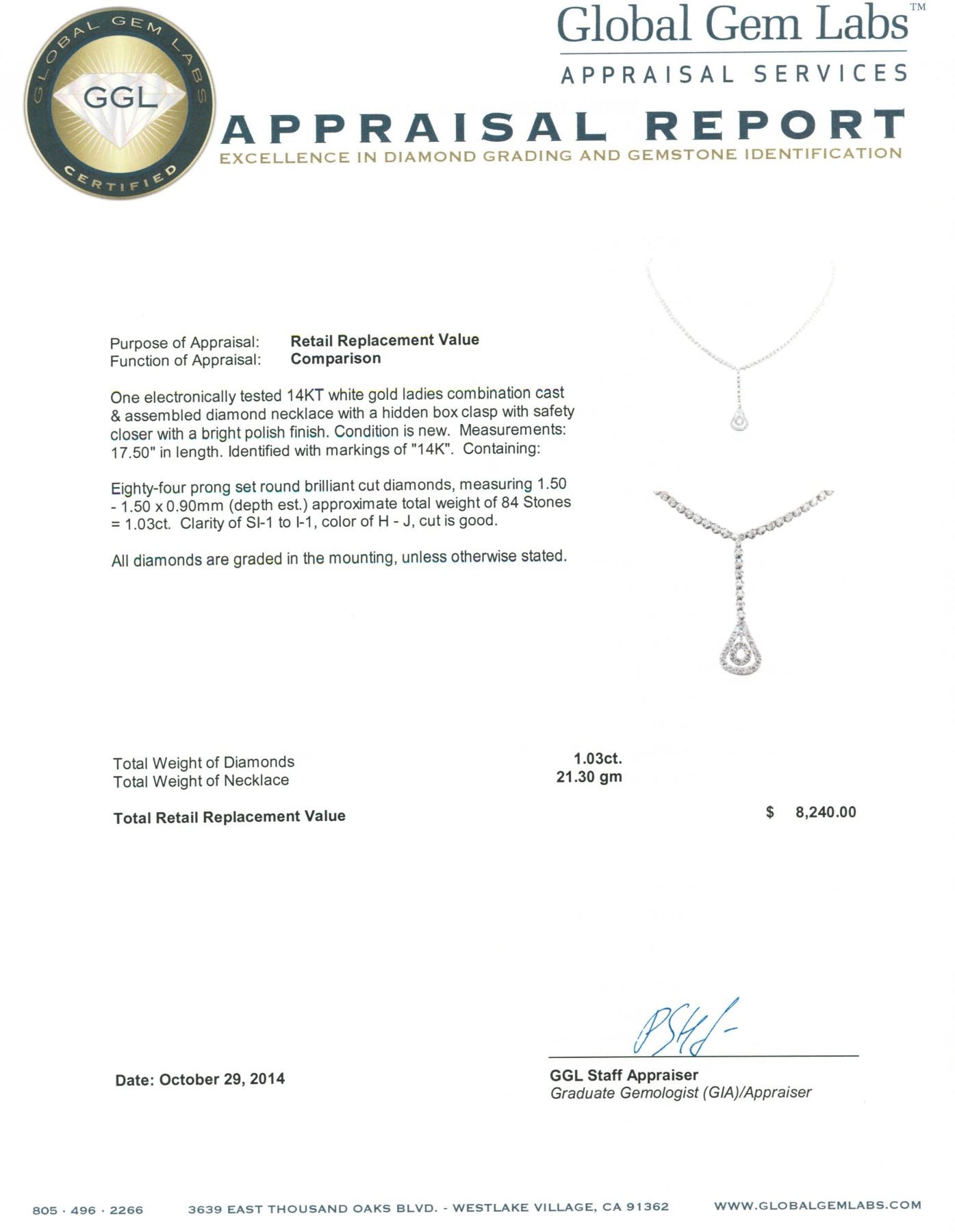 One electronically tested 14KT white gold ladies combination cast & assembled diamond necklace with a hidden box clasp with safety closer with a bright polish finish. Measurements: 17.50 in length. Identified with markings of 14K. Condition is new. Containing: Eighty-Four prong set round brilliant cut diamonds, measuring 1.50 - 1.50 x 0.90mm (depth est.) approximate total weight of 84 Stones = 1.03ct. Clarity: SI-1 to I-1. Color: H - J, Cut is Good. All diamonds are graded in the mounting, unless otherwise stated. Total Weight of Diamonds 1.03ct. Total Weight of Necklace 21.30 grams. GGL Appraised.