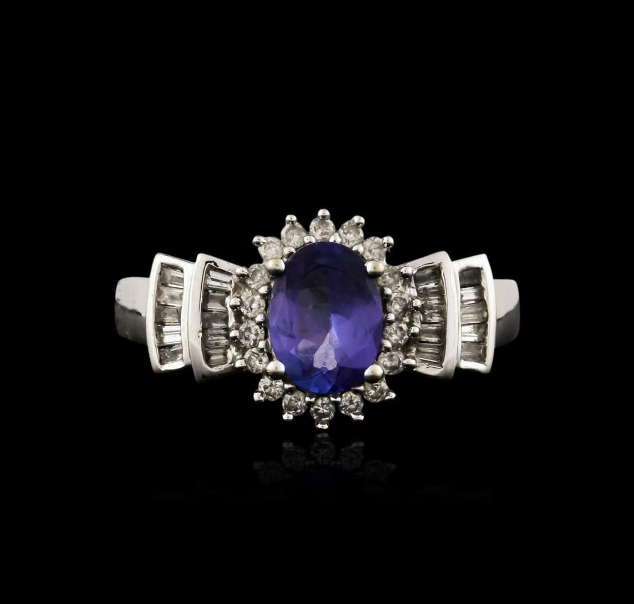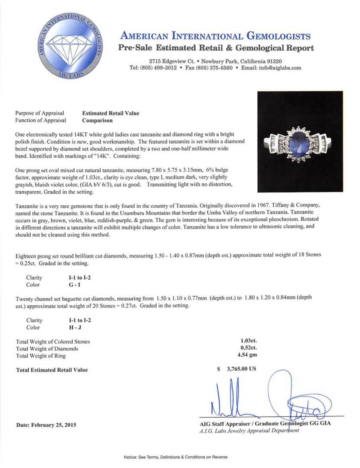 One electronically tested 14KT white gold ladies cast tanzanite and diamond ring with a bright polish finish. The featured tanzanite is set within a diamond bezel supported by diamond set shoulders, completed by a two and one-half millimeter wide band. Identified with markings of "14K". Condition is new, good workmanship. Containing: One prong set oval mixed cut natural tanzanite, measuring 7.80 x 5.75 x 3.15mm, 6%. bulge factor, approximate weight of 1.03ct., clarity is eye clean, type I, medium dark, very slightly grayish, bluish violet color, (GIA bV 6/3), cut is good. Transmitting light with no distortion, transparent. Graded in the setting. Tanzanite is a very rare gemstone that is only found in the country of Tanzania. Originally discovered in 1967. Tiffany & Company, named the stone Tanzanite. It is found in the Usumburu Mountains that border the Umba Valley of northern Tanzania. Tanzanite occurs in gray, brown, violet, blue, reddish-purple, & green. The gem is interesting because of its exceptional pleochroism. Rotated in different directions a tanzanite will exhibit multiple changes of color. Tanzanite has a low tolerance to ultrasonic cleaning, and should not be cleaned using this method. Eighteen prong set round brilliant cut diamonds, measuring 1.50 - 1.40 x 0.87mm (depth est.) approximate total weight of 18 Stones = 0.25ct. Graded in the setting. Clarity: I-1 to I-2. Color: G - I Twenty channel set baguette cut diamonds, measuring from 1.50 x 1.10 x 0.77mm (depth est.) to 1.80 x 1.20 x 0.84mm (depth est.) approximate total weight of 20 Stones = 0.27ct. Graded in the setting. Clarity: I-1 to I-2. Color: H - J. Total Weight of Colored Stones 1.03ct. Total Weight of Diamonds 0.52ct. Total Weight of Ring 4.54 grams. AIG Appraised at $3,765.00.