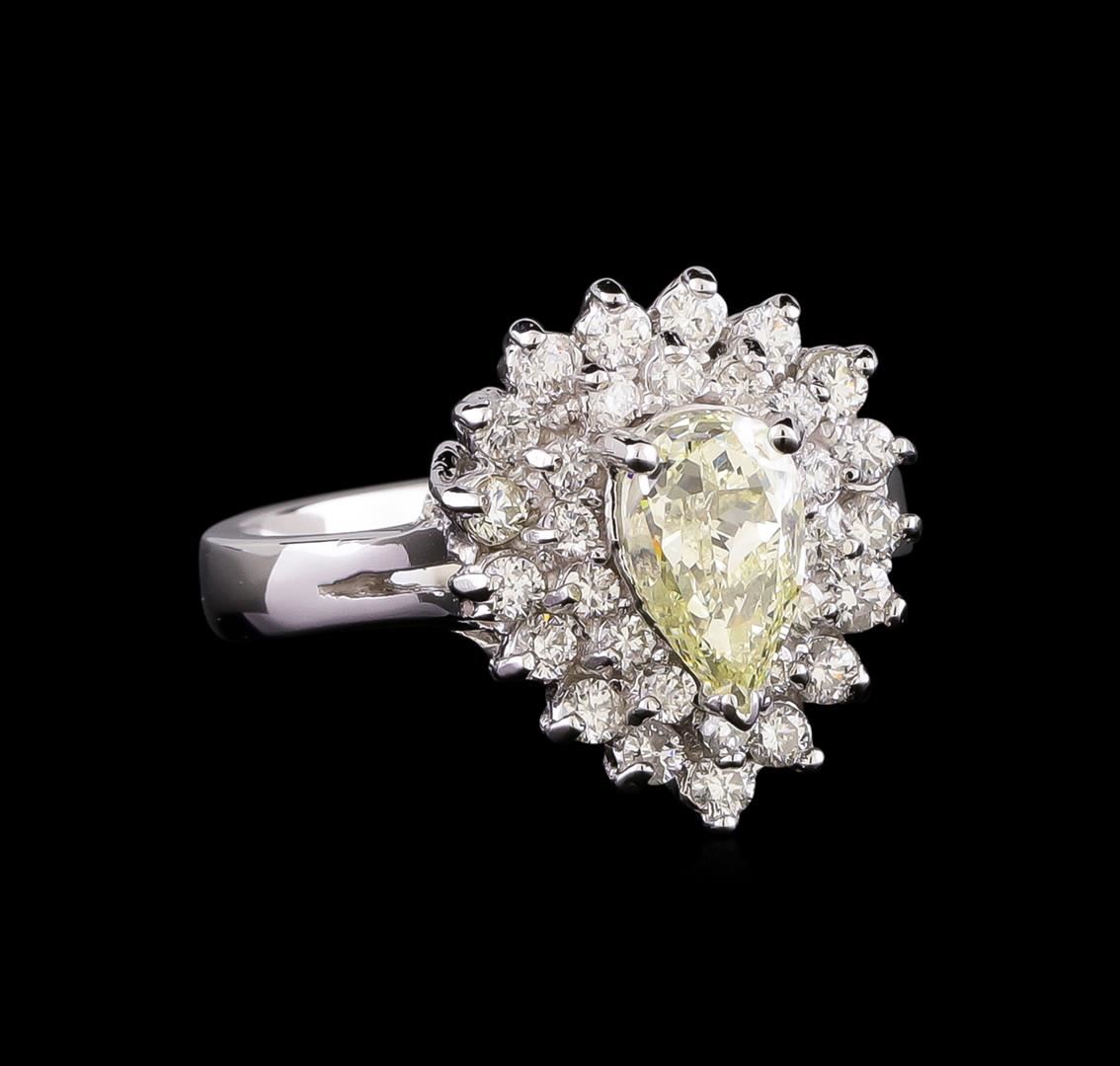 One electronically tested 14KT white gold ladies combination cast & assembled engagement ring with a flat shank with a bright polish finish. Identified with markings of "14K". Condition is new. Containing: One prong set pear shaped cut diamond, measuring 8.50 x 4.70 x 2.51mm (depth est.) approximate weight of 0.58ct. Clarity: SI-2, Cut is Good. Thirty-One prong set round brilliant cut diamonds, measuring 1.80 - 1.40 x 0.96mm (depth est.) approximate total weight of 31 Stones = 0.46ct. Clarity: SI-1 to SI-2. Color: G - H, Cut is Good. All diamonds are graded in the mounting, unless otherwise stated. Total Weight of Diamonds 1.04ct. Total Weight of Ring 5.30 grams. GGL Appraised at $6,765.00.