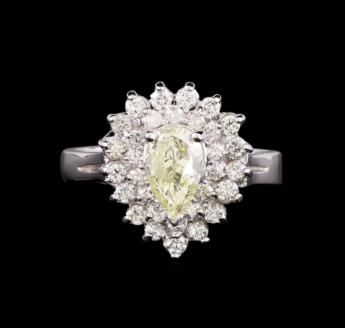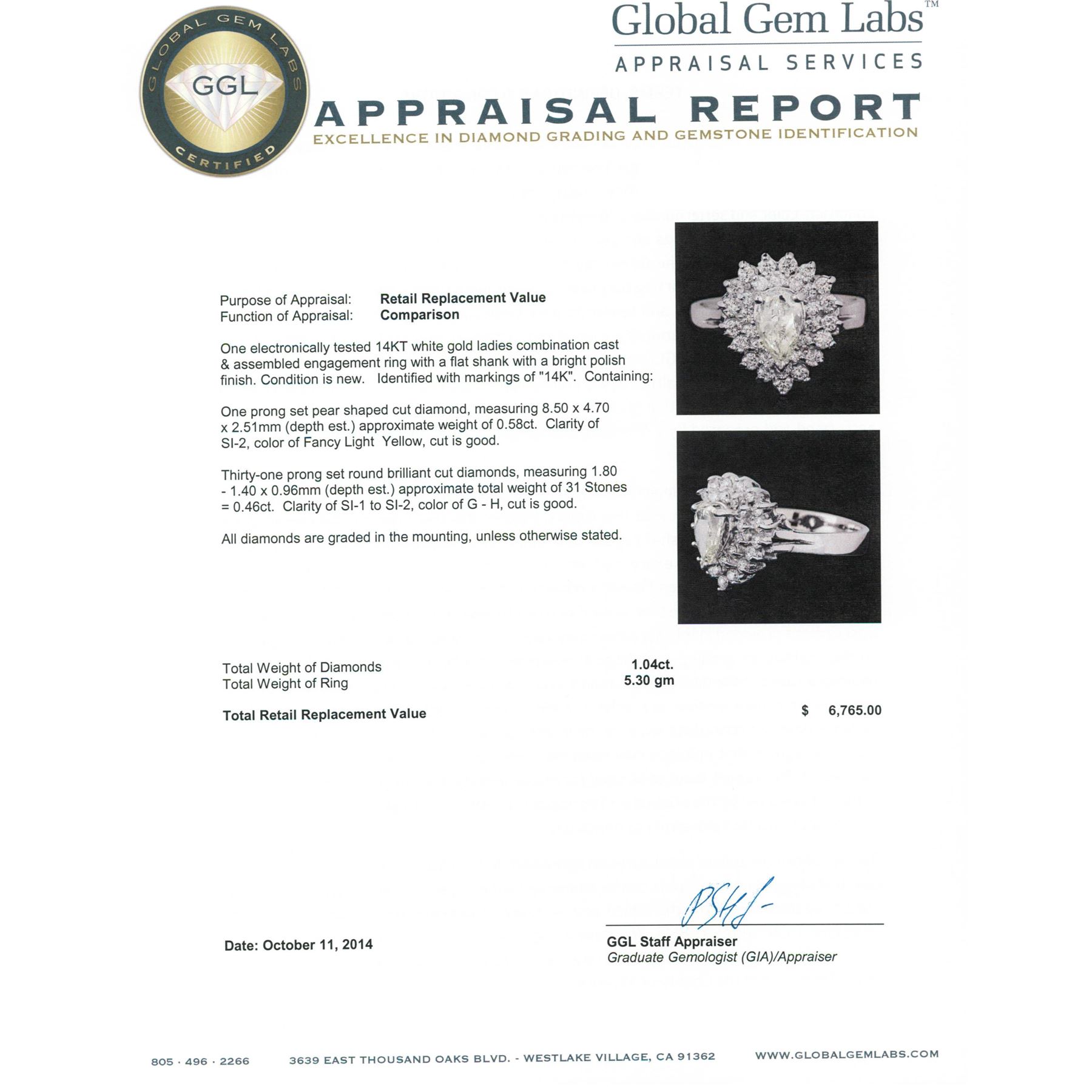 One electronically tested 14KT white gold ladies combination cast & assembled engagement ring with a flat shank with a bright polish finish. Identified with markings of "14K". Condition is new. Containing: One prong set pear shaped cut diamond, measuring 8.50 x 4.70 x 2.51mm (depth est.) approximate weight of 0.58ct. Clarity: SI-2, Cut is Good. Thirty-One prong set round brilliant cut diamonds, measuring 1.80 - 1.40 x 0.96mm (depth est.) approximate total weight of 31 Stones = 0.46ct. Clarity: SI-1 to SI-2. Color: G - H, Cut is Good. All diamonds are graded in the mounting, unless otherwise stated. Total Weight of Diamonds 1.04ct. Total Weight of Ring 5.30 grams. GGL Appraised.