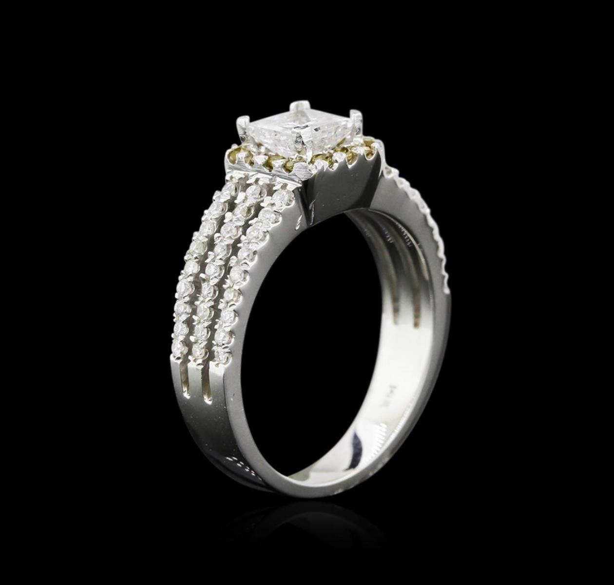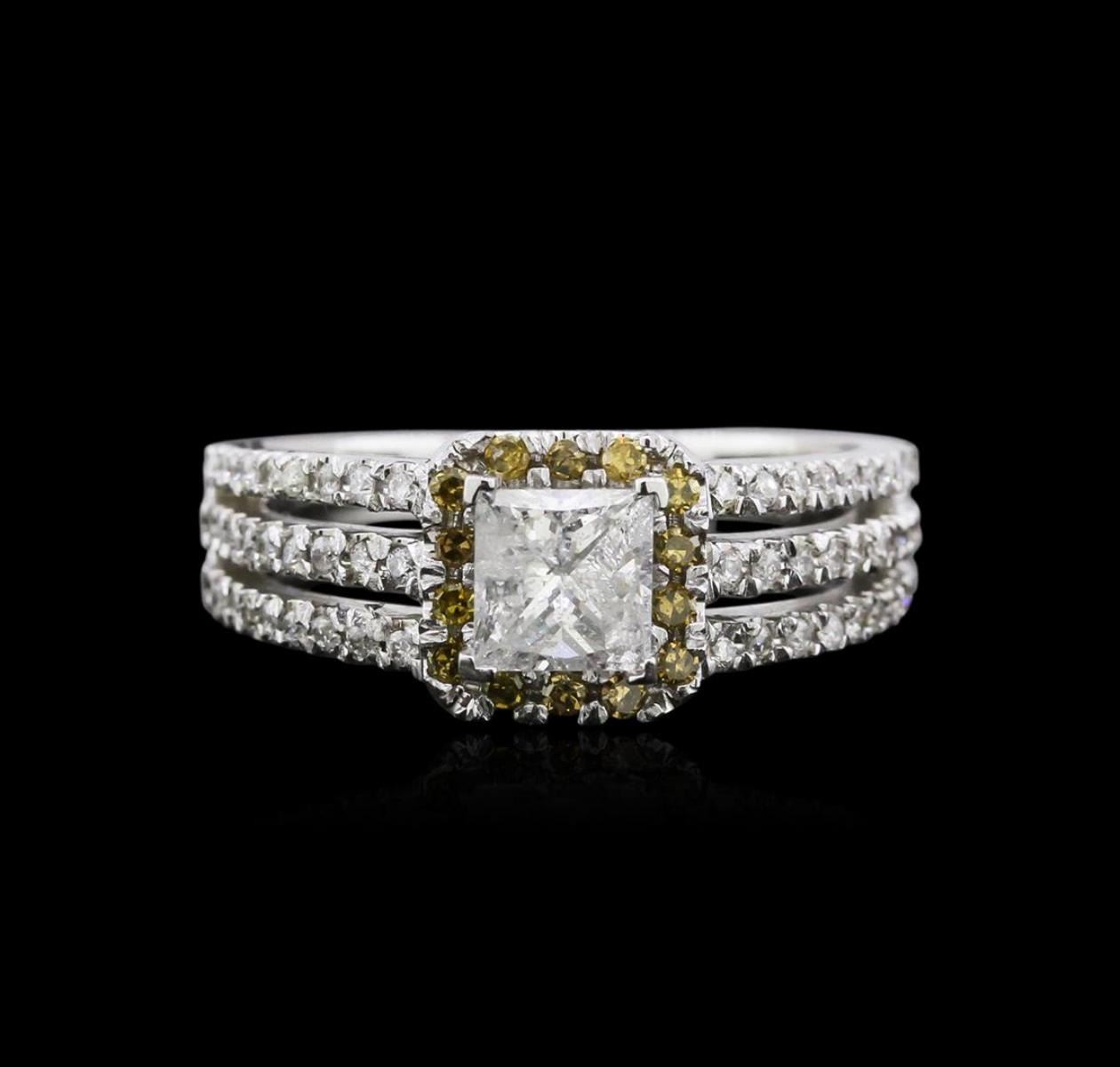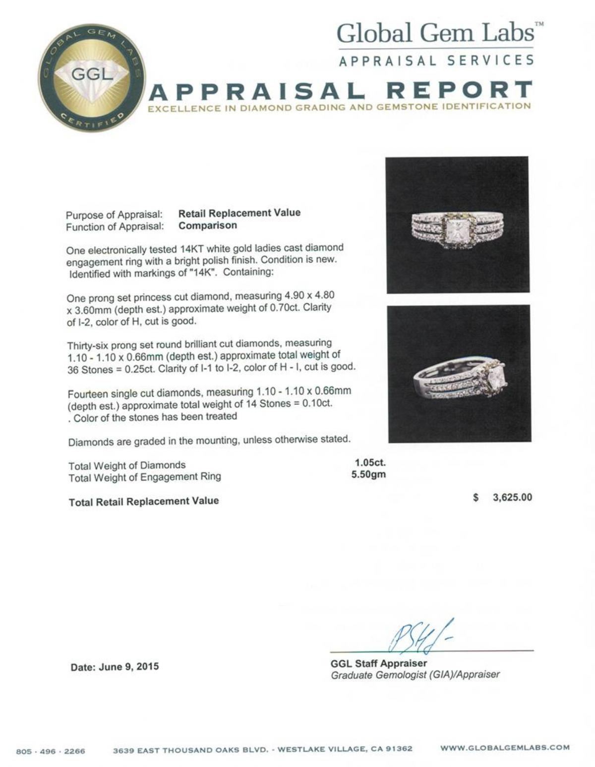 One electronically tested 14KT white gold ladies cast diamond ring with a bright polish finish. Identified with markings of "14K". Condition is new. Containing: One prong set princess cut diamond, measuring 4.90 x 4.80 x 3.60mm (depth est.) approximate weight of 0.70ct. Clarity: I-2. Color: H, Cut is Good. Thirty-Six prong set round brilliant cut diamonds, measuring 1.10 - 1.10 x 0.66mm (depth est.) approximate total weight of 36 Stones = 0.25ct. Clarity: I-1 to I-2. Color: H - I, Cut is Good. Fourteen single cut diamonds, measuring 1.10 - 1.10 x 0.66mm (depth est.) approximate total weight of 14 Stones = 0.10ct. Color of the stones has been treated. Diamonds are graded in the mounting, unless otherwise stated. Total Weight of Diamonds 1.05ct. Total Weight of Ring 5.50 grams. GGL Appraised at $3,625.00.