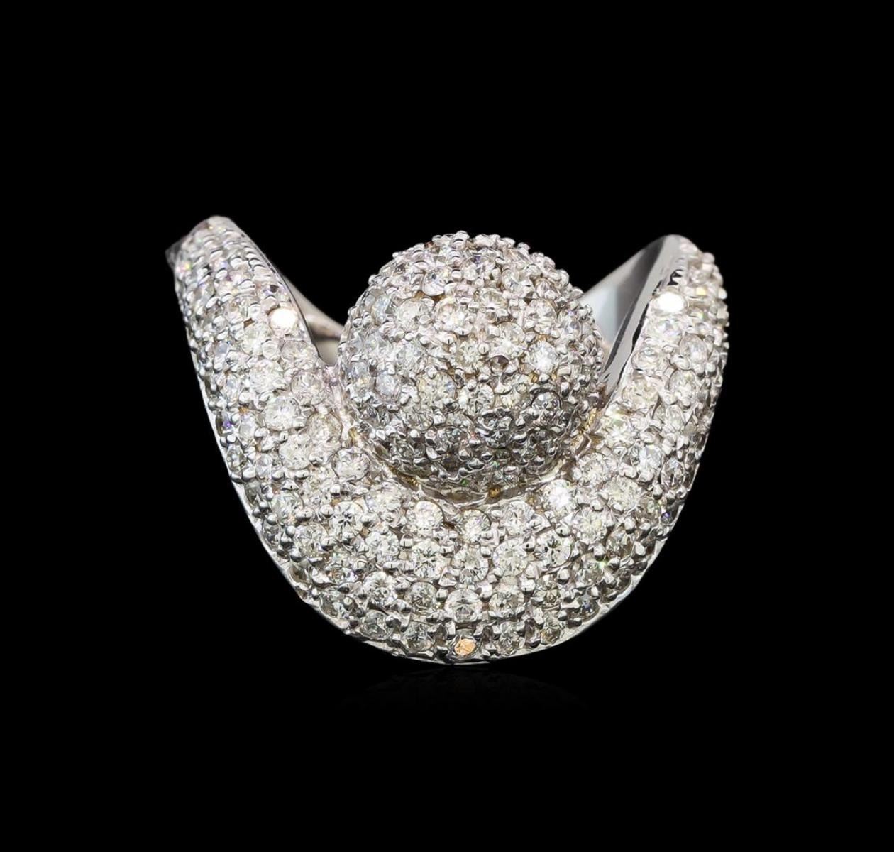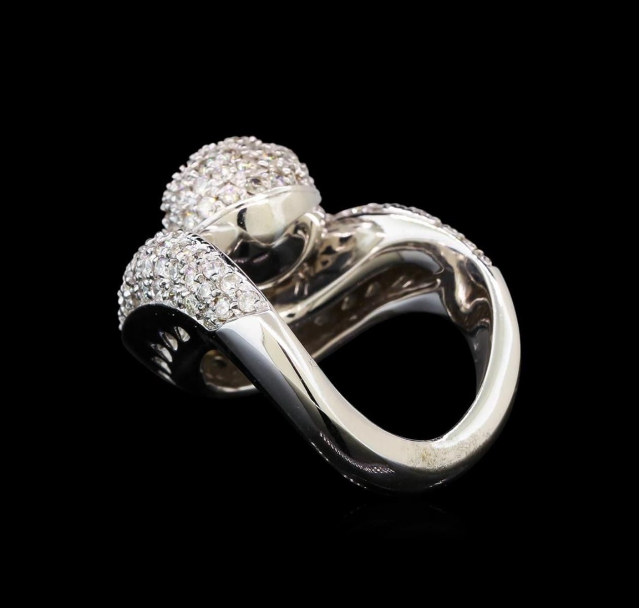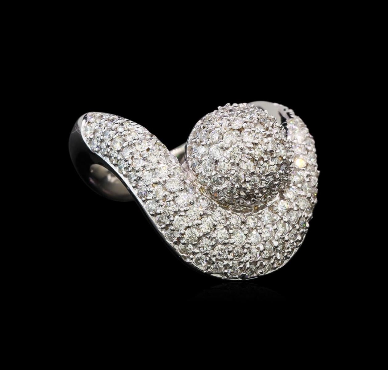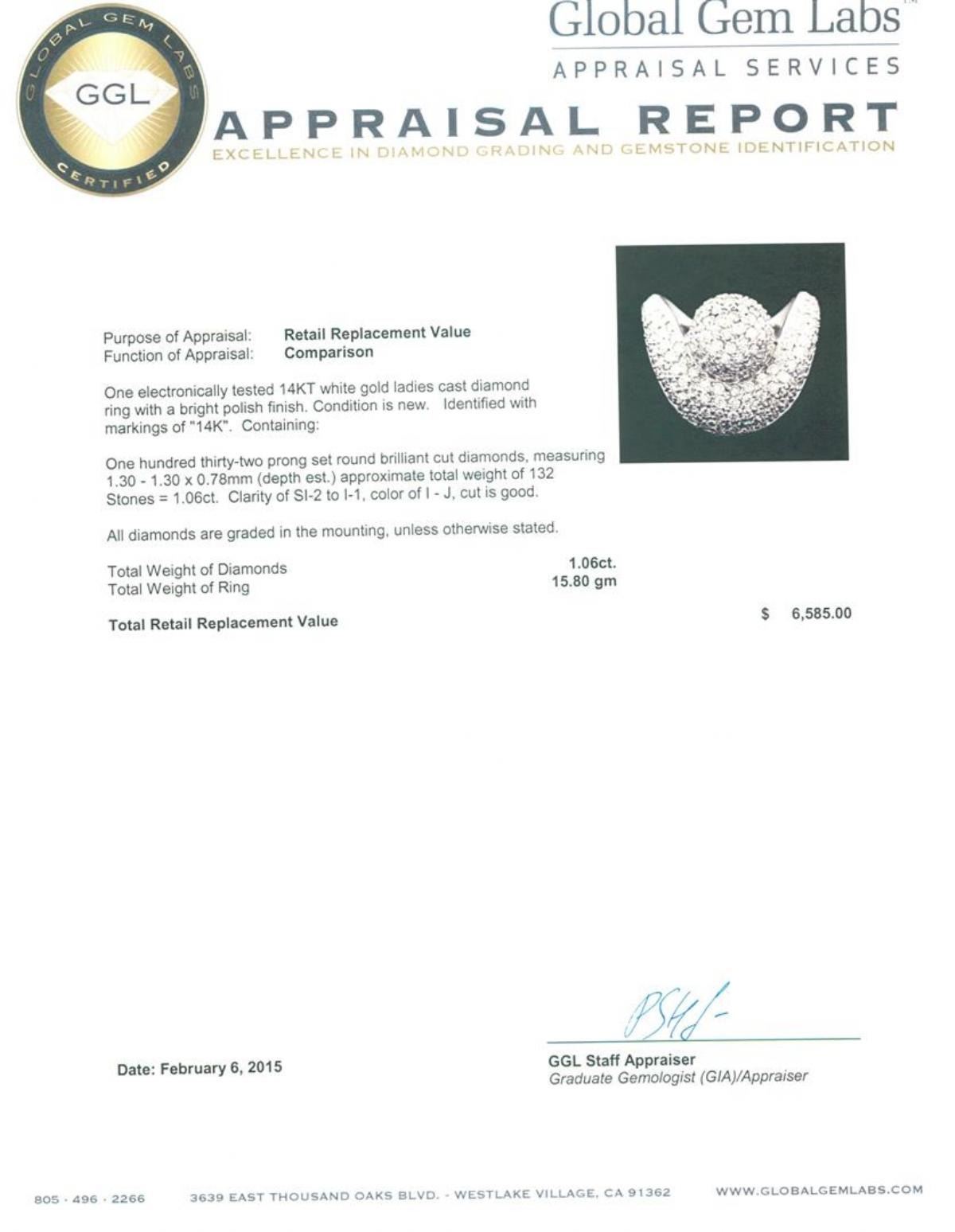 One electronically tested 14KT white gold ladies cast diamond ring with a bright polish finish. Identified with markings of "14K". Condition is new. Containing: One Hundred Thirty-Two prong set round brilliant cut diamonds, measuring 1.30 - 1.30 x 0.78mm (depth est.) approximate total weight of 132 Stones = 1.06ct. Clarity: SI-2 to I-1. Color: I - J, Cut is Good. All diamonds are graded in the mounting, unless otherwise stated. Total Weight of Diamonds 1.06ct. Total Weight of Ring 15.80 grams. GGL Appraised.
