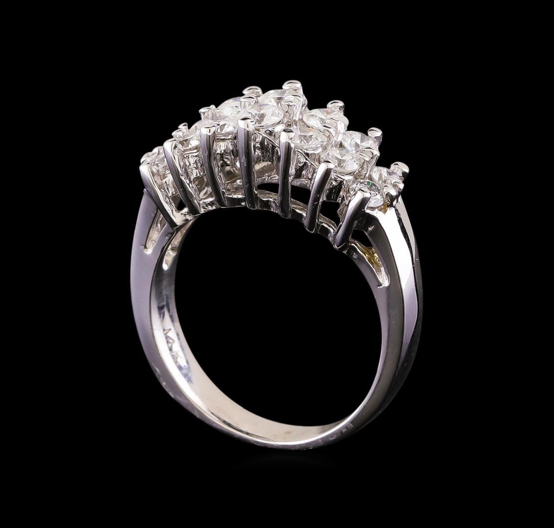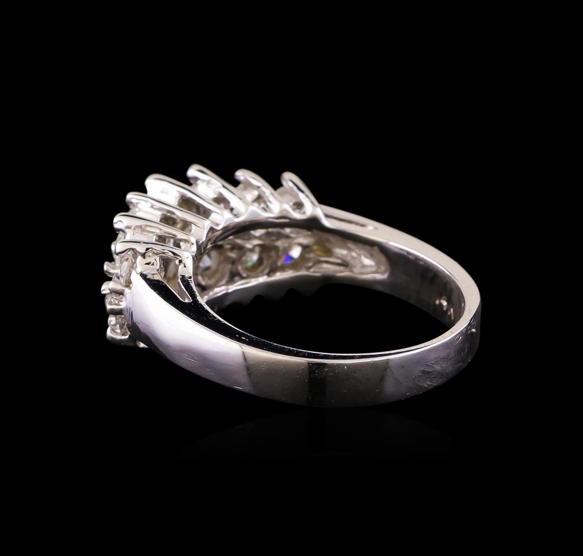 One electronically tested 14KT white gold ladies cast diamond ring with a bright polish finish. Identified with markings of "14K". Condition is new. Containing: Fourteen prong set round brilliant cut diamonds, measuring 3.00 - 2.50 x 1.65mm (depth est.) approximate total weight of 14 Stones = 1.07ct. Clarity: SI-2 to I-1. Color: I - J, Cut is Good. All diamonds are graded in the mounting, unless otherwise stated. Total Weight of Diamonds 1.07ct. Total Weight of Ring 5.60 grams. GGL Appraised.