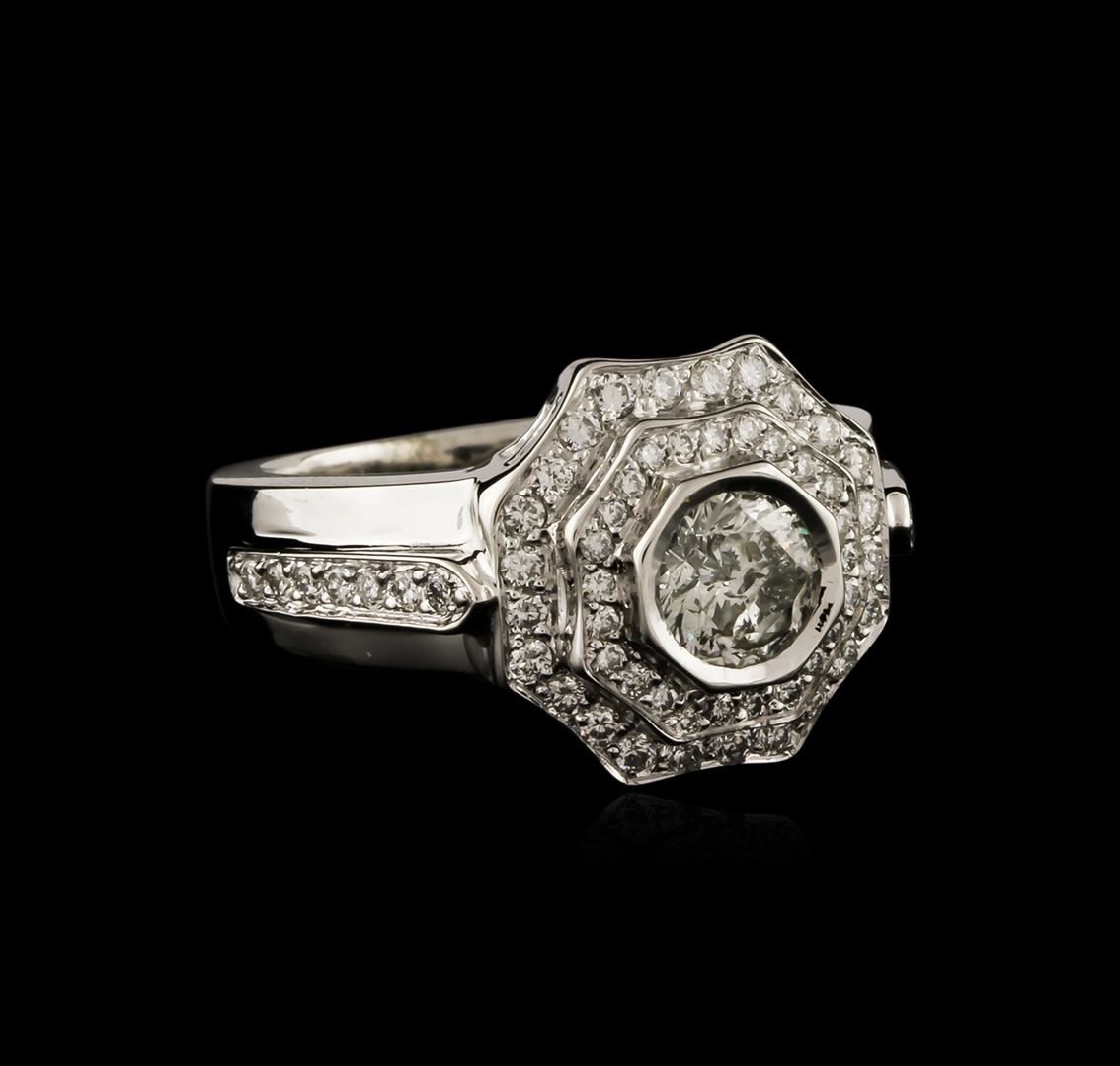One electronically tested 14KT white gold ladies cast diamond engagement ring with a bright polish finish. Identified with markings of "14K". Condition is new. Containing: One bezel set round brilliant cut diamond, measuring 5.80 - 5.80 x 3.48mm (depth est.) approximate weight of 0.71ct. Clarity: I-2. Color: K. Sixty prong set round brilliant cut diamonds, measuring 1.20 - 1.20 x 0.72mm (depth est.) approximate total weight of 60 Stones = 0.38ct. Clarity: SI-2 to I-1. Color: J - K, Cut is Good. All diamonds are graded in the mounting, unless otherwise stated. Total Weight of Diamonds 1.09ct. Total Weight of Engagement Ring 13.90 grams. GGL Appraised.