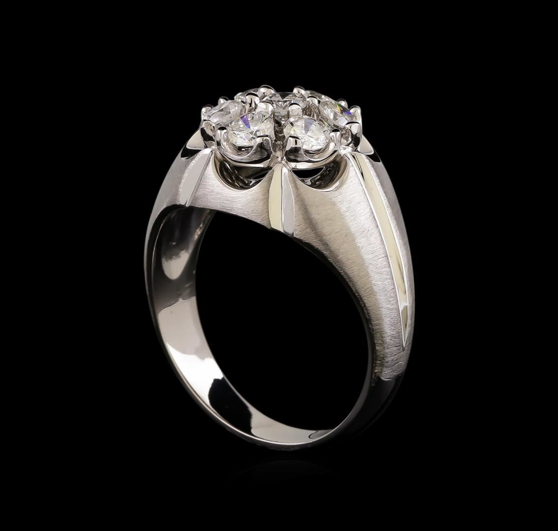 One electronically tested 14KT white gold mens combination cast & assembled diamond ring with a brushed finish. Identified with markings of "14K". Condition is new. Containing: Seven prong set round brilliant cut diamonds, measuring 3.50 - 3.50 x 2.10mm (depth est.) approximate total weight of 7 Stones = 1.10 ct. Clarity: SI-2 to I-1. Color: H - I, Cut is Good. All diamonds are graded in the mounting, unless otherwise stated. Total Weight of Diamonds 1.10 ct. Total Weight of Ring 10.80 grams. GGL Appraised.