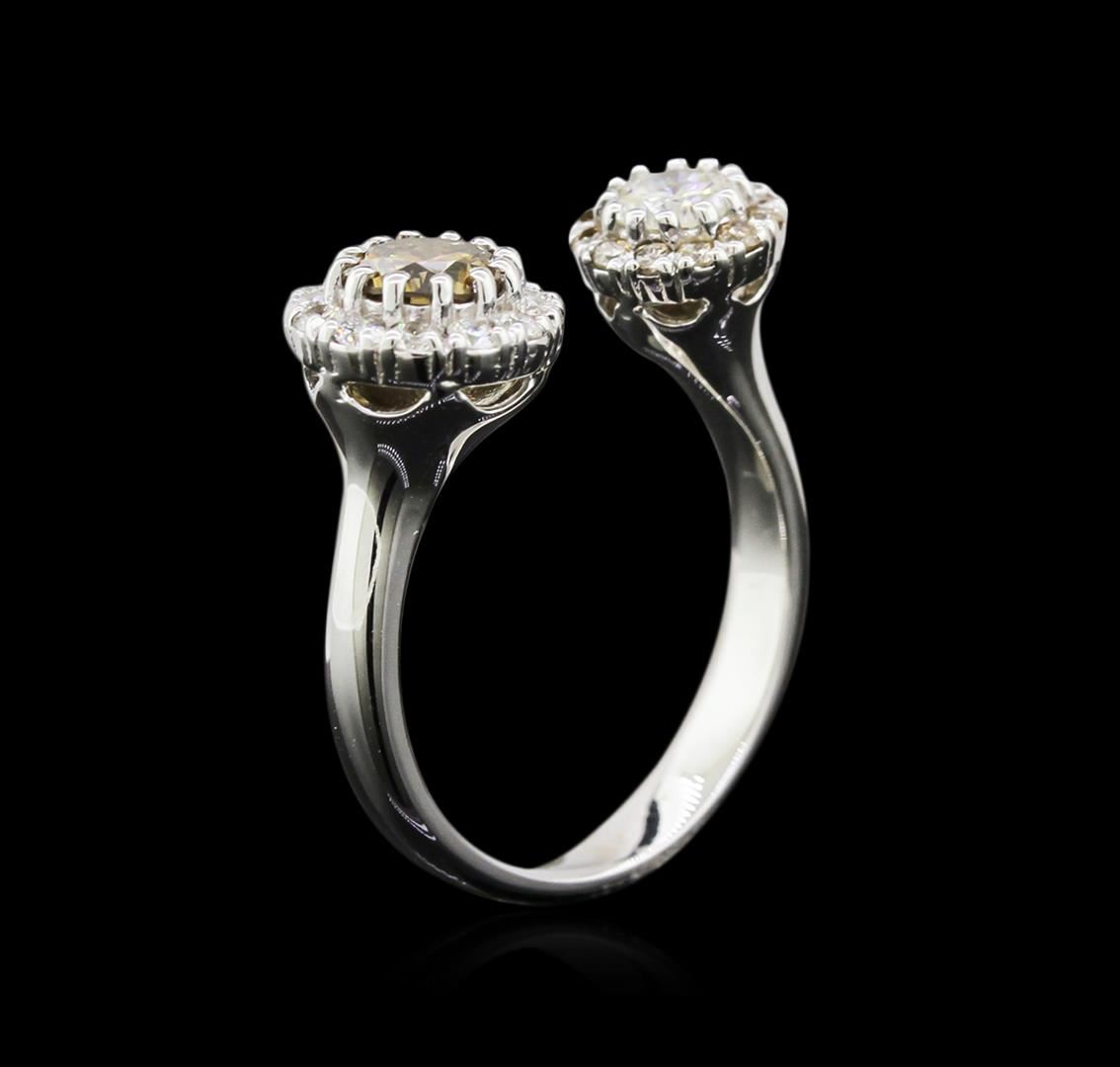 One electronically tested 14KT white gold ladies cast diamond ring with a bright polish finish. Identified with markings of "K14". Condition is new. Containing: One prong set round brilliant cut diamond, measuring 5.30 - 5.30 x 3.18mm (depth est.) approximate weight of 0.55ct. Clarity: SI-2, Cut is Good. One prong set round brilliant cut diamond, measuring 4.20 - 4.20 x 2.52mm (depth est.) approximate weight of 0.25ct. Clarity: SI-1. Color: I, Cut is Very Good. Thirteen prong set round brilliant cut diamonds, measuring 1.50 - 1.50 x 0.90mm (depth est.) approximate total weight of 13 Stones = 0.16ct. Clarity: SI-1. Color: H - I, Cut is Good. Twelve prong set round brilliant cut diamonds, measuring 1.50 - 1.50 x 0.90mm (depth est.) approximate total weight of 12 Stones = 0.14ct. Clarity: SI-2 to I-1, Cut is Good. Diamonds are graded in the mounting, unless otherwise stated. Total Weight of Diamonds 1.10 ct. Total Weight of Ring 4.10 grams. GGL Appraised.