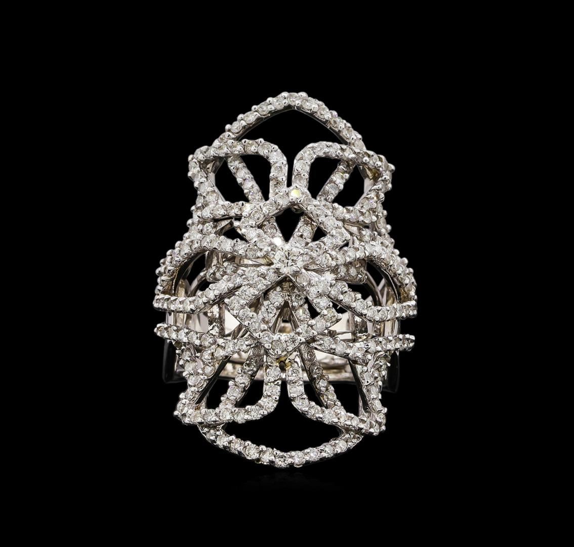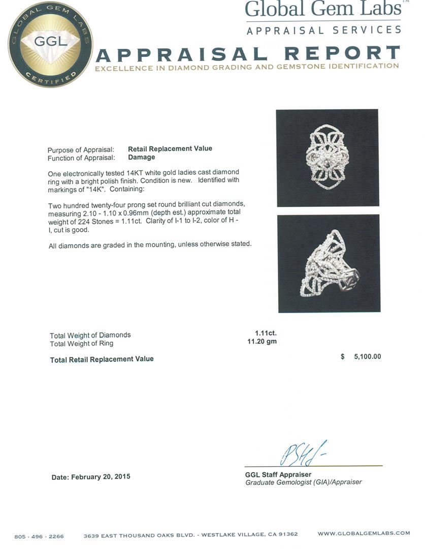One electronically tested 14KT white gold ladies cast diamond ring with a bright polish finish. Identified with markings of "14K". Condition is new. Containing: Two Hundred Twenty-Four prong set round brilliant cut diamonds, measuring 2.10 - 1.10 x 0.96mm (depth est.) approximate total weight of 224 Stones = 1.11ct. Clarity: I-1 to I-2. Color: H - I, Cut is Good. All diamonds are graded in the mounting, unless otherwise stated. Total Weight of Diamonds 1.11ct. Total Weight of Ring 11.20 grams. GGL Appraised at $5,100.00.