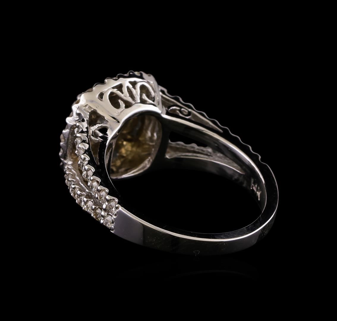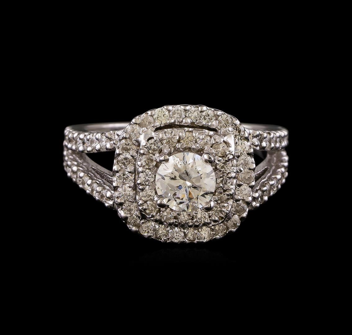 One electronically tested 14KT white gold ladies combination cast & assembled diamond engagement ring with a bright polish finish. Identified with markings of "14K". Condition is new. Containing: One prong set round brilliant cut diamond, measuring 5.30 - 5.20 x 3.15mm (depth est.) approximate weight of 0.53ct. Clarity: I-2. Color: J, Cut is Good. Seventy-Two prong set round brilliant cut diamonds, measuring 1.30 - 1.30 x 0.78mm (depth est.) approximate total weight of 72 Stones = 0.58ct. Clarity: SI-2 to I-2. Color: I - J, Cut is Good. All diamonds are graded in the mounting, unless otherwise stated. Total Weight of Diamonds 1.11ct. Total Weight of Ring 5.10 grams. GGL Appraised at $5,290.00.