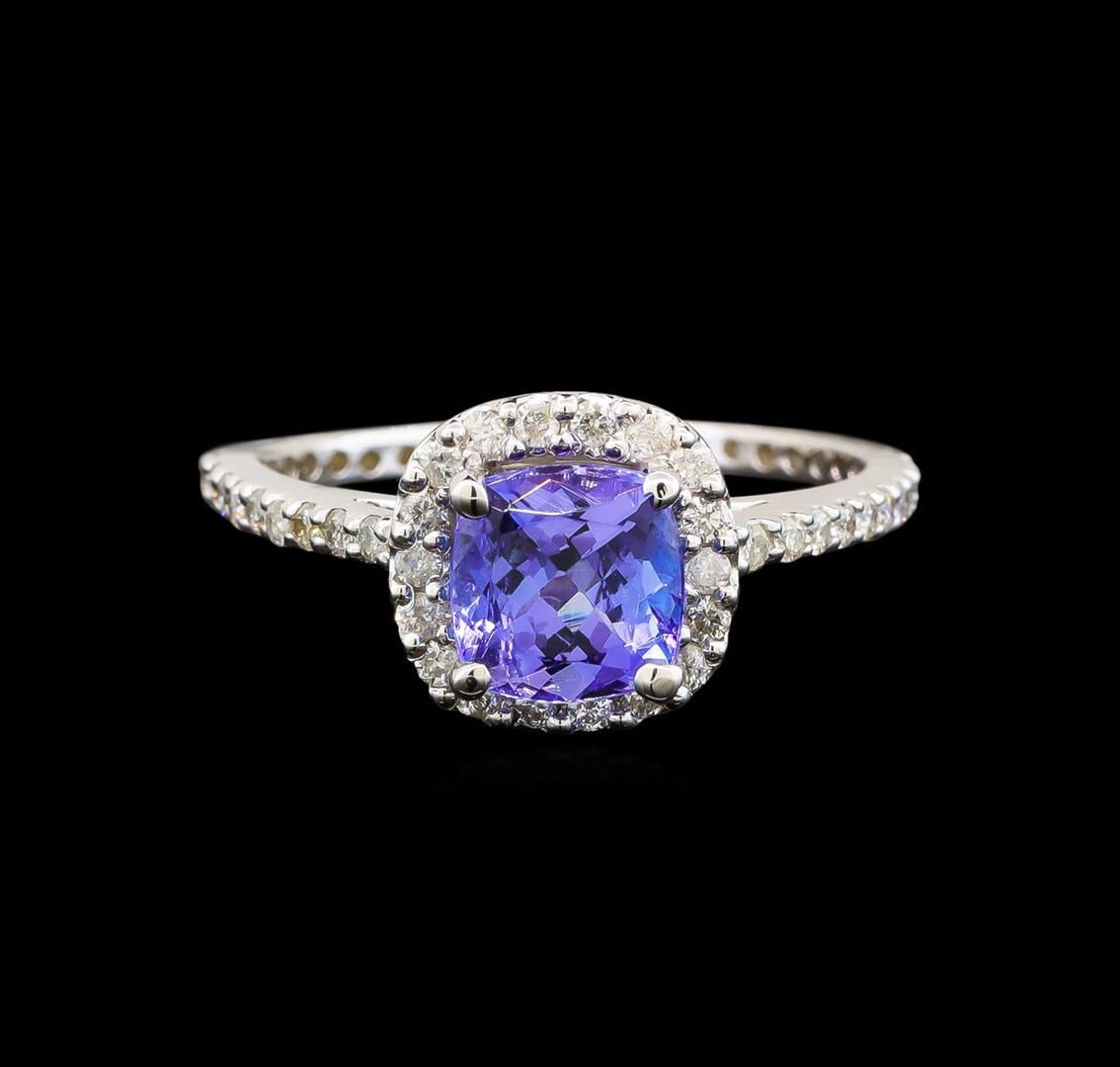 One electronically tested 14KT white gold ladies cast tanzanite and diamond ring with a flat shank with a bright polish finish. Trademark is Orianne. Identified with markings of "14K". Condition is new. Containing: One prong set square cushion modified brilliant cut natural tanzanite, measuring 6.00 x 6.00 x 3.90mm, approximate weight of 1.11ct., clarity is eye clean, type I, medium, very slightly grayish, violet color, (GIA V 5/3), cut is good. Fifty-Six prong set round brilliant cut diamonds, measuring 1.20 - 1.20 x 0.72mm (depth est.) approximate total weight of 56 Stones = 0.35ct. Clarity: SI-2 to I-2. Color: I - J, Cut is Good. All diamonds and colored gemstones are graded in the mounting, unless otherwise stated. Colored gemstones are presumed to have been subjected to commonly used enhancement processes.. Total Weight of Colored Stones 1.11ct. Total Weight of Diamonds 0.35ct. Total Weight of Ring 2.60 grams. GGL Appraised.