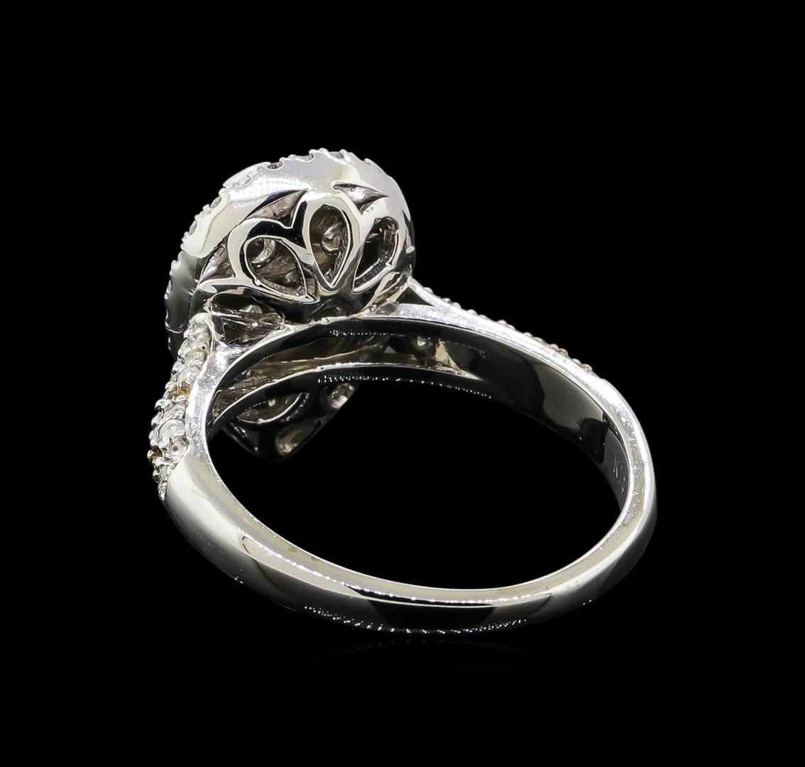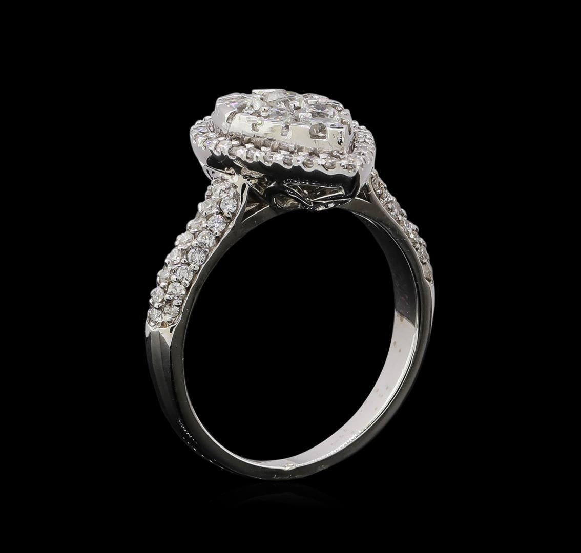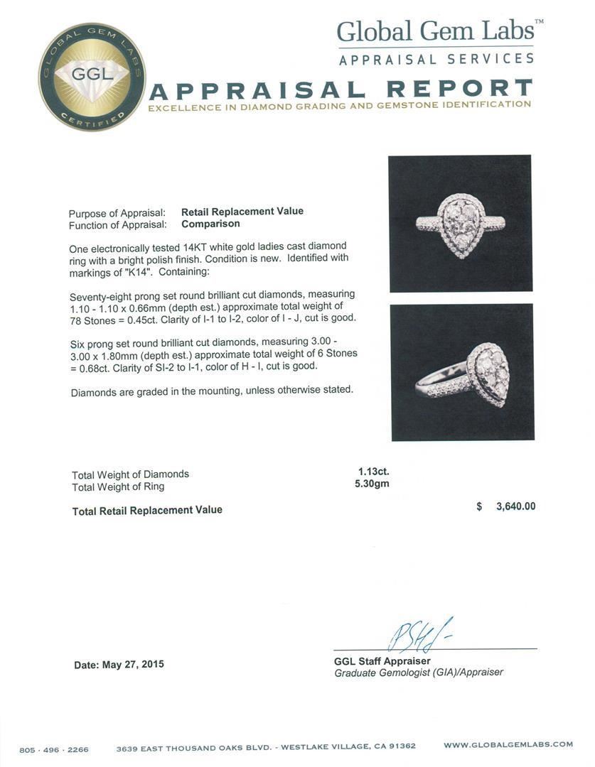One electronically tested 14KT white gold ladies cast diamond ring with a bright polish finish. Identified with markings of "K14". Condition is new. Containing: Seventy-Eight prong set round brilliant cut diamonds, measuring 1.10 - 1.10 x 0.66mm (depth est.) approximate total weight of 78 Stones = 0.45ct. Clarity: I-1 to I-2. Color: I - J, Cut is Good. Six prong set round brilliant cut diamonds, measuring 3.00 - 3.00 x 1.80mm (depth est.) approximate total weight of 6 Stones = 0.68ct. Clarity: SI-2 to I-1. Color: H - I, Cut is Good. Diamonds are graded in the mounting, unless otherwise stated. Total Weight of Diamonds 1.13ct. Total Weight of Ring 5.30 grams. GGL Appraised.