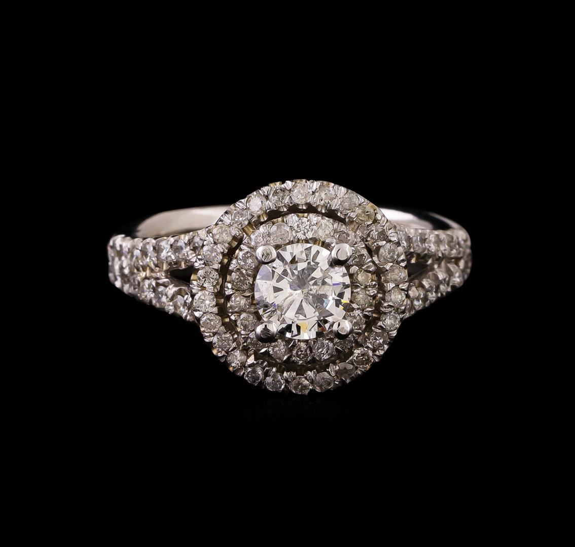 One electronically tested 14KT white gold ladies cast diamond engagement ring with a bright polish finish. Identified with markings of "14K". Condition is new. Containing: One prong set round brilliant cut diamond, measuring 5.30 - 5.30 x 3.18mm (depth est.) approximate weight of 0.55ct. Clarity: I-1. Color: J, Cut is Good. Seventy-Six prong set round brilliant cut diamonds, measuring 1.30 - 1.30 x 0.78mm (depth est.) approximate total weight of 76 Stones = 0.61ct. Clarity: SI-2 to I-2. Color: H - I, Cut is Good. All diamonds are graded in the mounting, unless otherwise stated. Total Weight of Diamonds 1.15ct. Total Weight of Ring 5.60 grams. GGL Appraised.