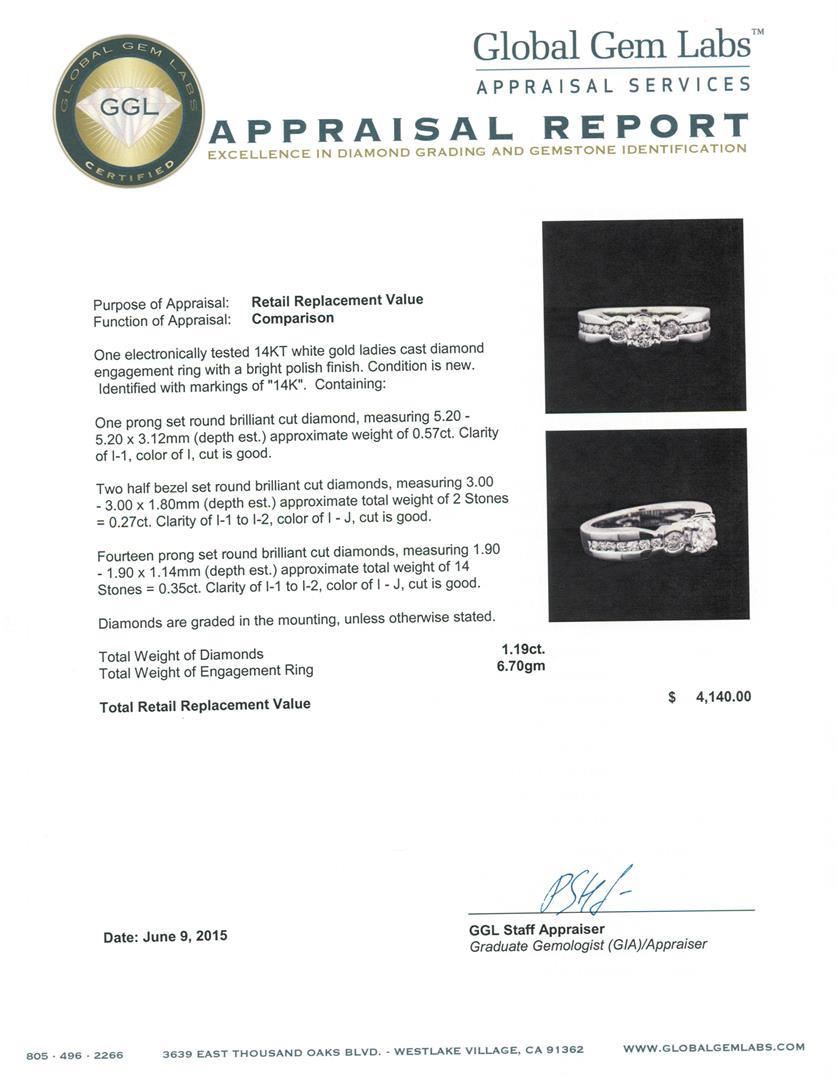 One electronically tested 14KT white gold ladies cast diamond ring with a bright polish finish. Identified with markings of "14K". Condition is new. Containing: One prong set round brilliant cut diamond, measuring 5.20 - 5.20 x 3.12mm (depth est.) approximate weight of 0.57ct. Clarity: I-1. Color: I, Cut is Good. Two half bezel set round brilliant cut diamonds, measuring 3.00 - 3.00 x 1.80mm (depth est.) approximate total weight of 2 Stones = 0.27ct. Clarity: I-1 to I-2. Color: I - J, Cut is Good. Fourteen prong set round brilliant cut diamonds, measuring 1.90 - 1.90 x 1.14mm (depth est.) approximate total weight of 14 Stones = 0.35ct. Clarity: I-1 to I-2. Color: I - J, Cut is Good. Diamonds are graded in the mounting, unless otherwise stated. Total Weight of Diamonds 1.19ct. Total Weight of Ring 6.70 grams. GGL Appraised.
