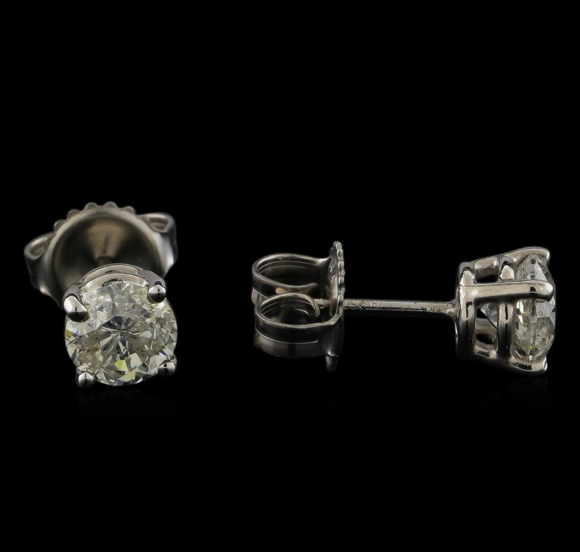 One pair electronically tested 14KT white gold ladies cast stud earrings with friction posts with a bright polish finish. Identified with markings of "14K". Condition is new. Containing: One prong set round brilliant cut diamond, measuring 5.45 - 5.44 x 3.26mm (depth est.) approximate weight of 0.59ct. Clarity: I-3. Color: J, Cut is Good. One prong set round brilliant cut diamond, measuring 5.44 - 5.48 x 3.30mm (depth est.) approximate weight of 0.60ct. Clarity: I-3. Color: J, Cut is Good. All diamonds are graded in the mounting, unless otherwise stated total weight of Diamonds 1.19ct. Total Weight of Earrings 1.60 grams. GGL Appraised at $3,960.00.