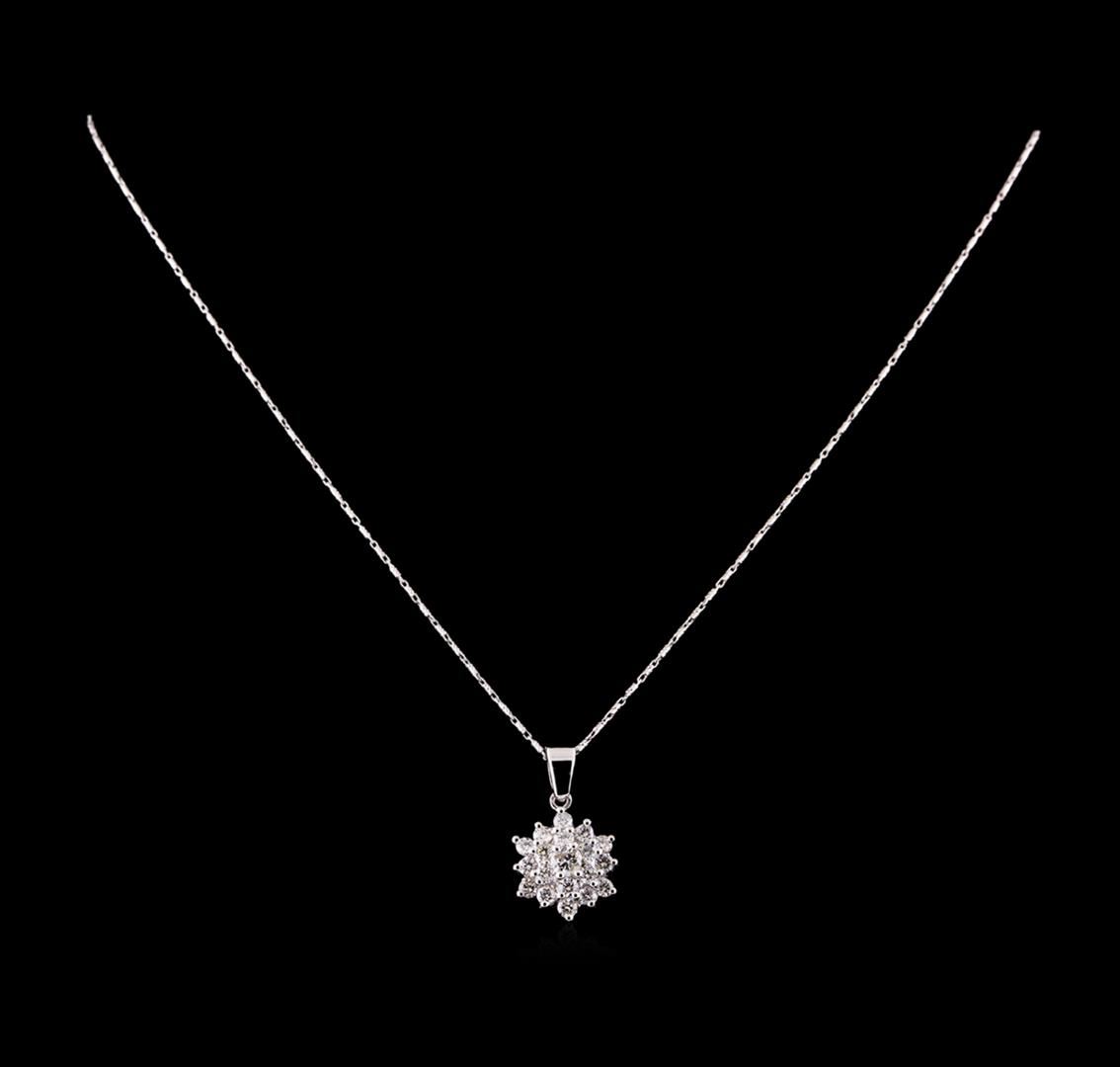 One electronically tested 14KT white gold ladies combination cast & assembled diamond pendant & chain 18.0" long, fancy link with a lobster claw clasp with a bright polish finish. Identified with markings of "14K". Condition is new. Containing: Eighteen prong set round brilliant cut diamonds, measuring 3.60 - 2.50 x 1.83mm (depth est.) approximate total weight of 18 Stones = 1.20ct. Clarity: SI-2 to I-1. Color: I - J, Cut is Good. All diamonds are graded in the mounting, unless otherwise stated. Total Weight of Diamonds 1.20ct. Total Weight of Pendant & Chain 7.20 grams. GGL Appraised.