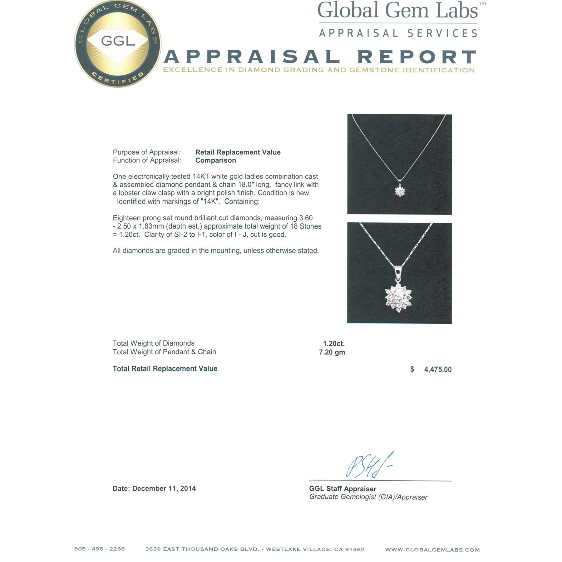 One electronically tested 14KT white gold ladies combination cast & assembled diamond pendant & chain 18.0" long, fancy link with a lobster claw clasp with a bright polish finish. Identified with markings of "14K". Condition is new. Containing: Eighteen prong set round brilliant cut diamonds, measuring 3.60 - 2.50 x 1.83mm (depth est.) approximate total weight of 18 Stones = 1.20ct. Clarity: SI-2 to I-1. Color: I - J, Cut is Good. All diamonds are graded in the mounting, unless otherwise stated. Total Weight of Diamonds 1.20ct. Total Weight of Pendant & Chain 7.20 grams. GGL Appraised.