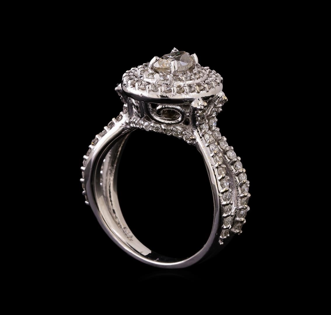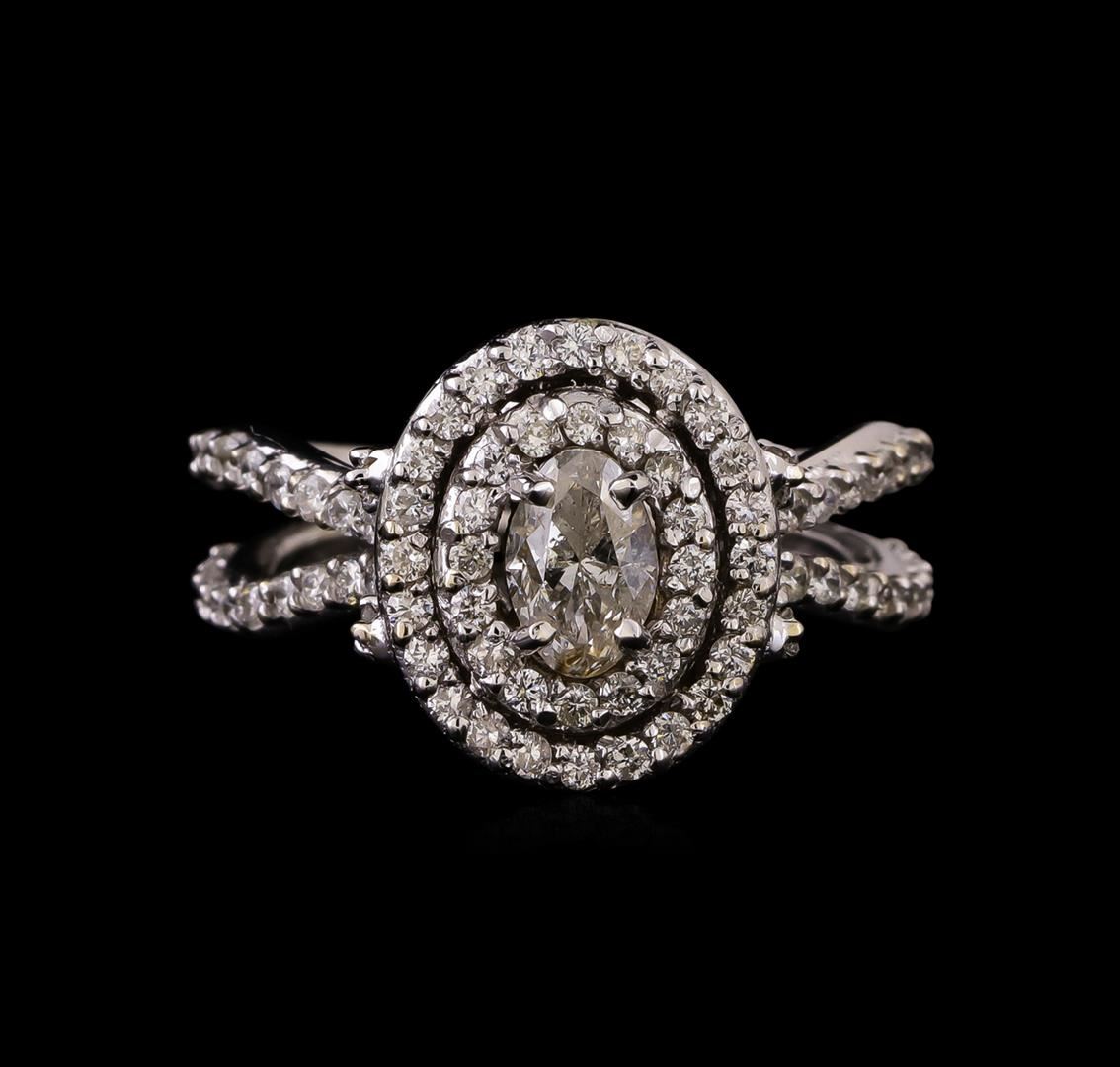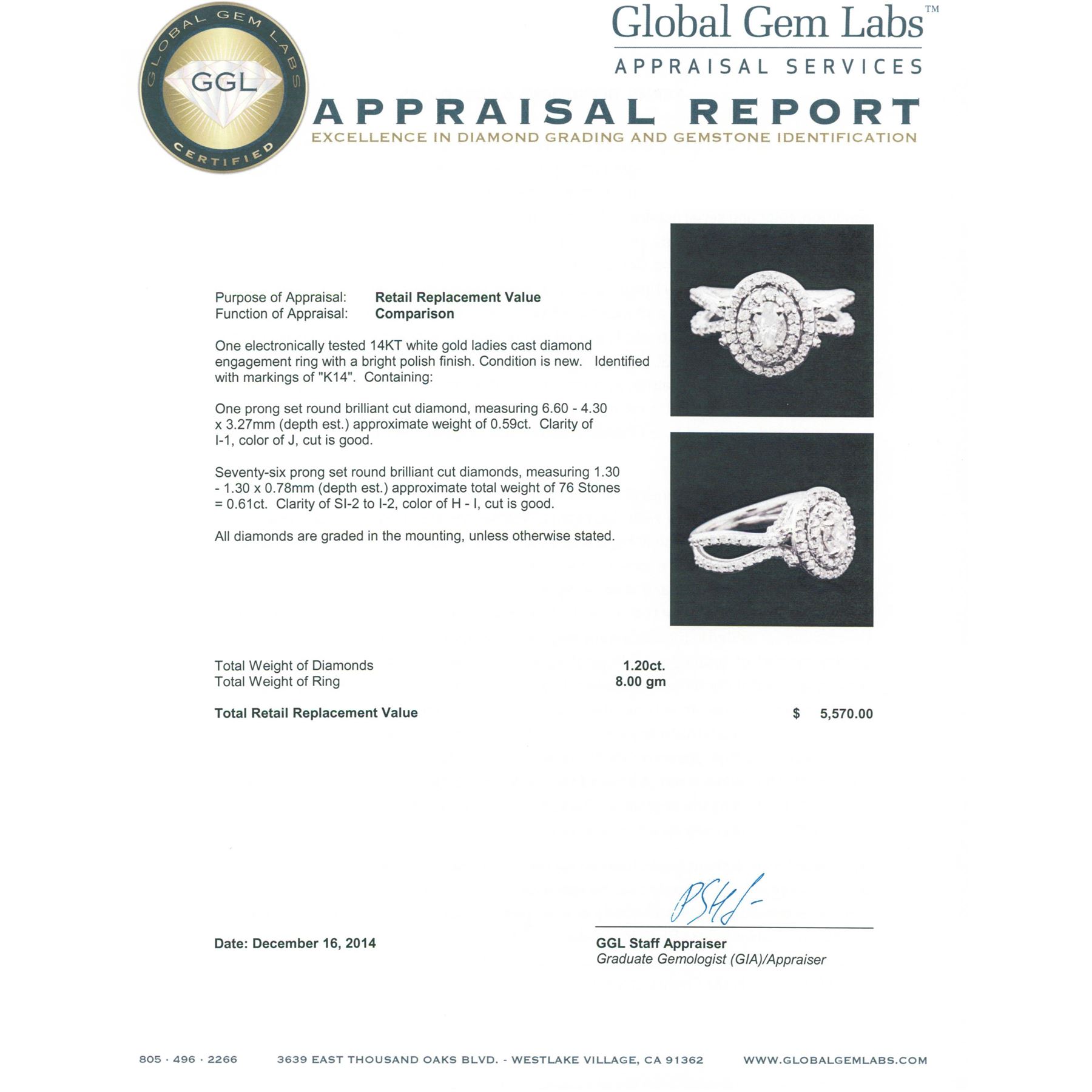 One electronically tested 14KT white gold ladies cast diamond engagement ring with a bright polish finish. Identified with markings of "K14". Condition is new. Containing: One prong set round brilliant cut diamond, measuring 6.60 - 4.30 x 3.27mm (depth est.) approximate weight of 0.59ct. Clarity: I-1. Color: J, Cut is Good. Seventy-Six prong set round brilliant cut diamonds, measuring 1.30 - 1.30 x 0.78mm (depth est.) approximate total weight of 76 Stones = 0.61ct. Clarity: SI-2 to I-2. Color: H - I, Cut is Good. All diamonds are graded in the mounting, unless otherwise stated. Total Weight of Diamonds 1.20ct. Total Weight of Ring 8.00 grams. GGL Appraised.