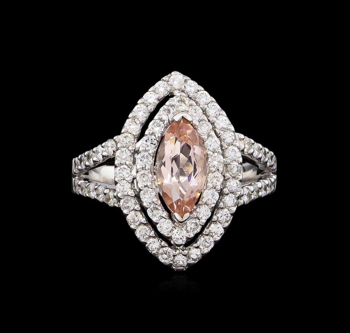 One electronically tested 14KT white gold Ladies combination cast & assembled ring with a bright polish finish. Condition is new. Identified with markings of "14K". Containing: Sixty-Six prong set round brilliant cut diamonds, measuring 1.70 - 1.70 x 1.02mm (depth est.) approximate. Total Weight of 66 Stones = 1.24ct. Clarity: I-1 to I-2. Color: H - J, Cut is Good. One prong set marquise modified brilliant cut natural morganite, measuring 11.00 x 5.00 x 3.25mm, approximate weight of 1.20ct., clarity is eye clean, type I, light, brownish, reddish orange color, (GIA rO 3/1), cut is very good. Colored gemstones are presumed to have been subjected to commonly used color/clarity enhancement processes. Total Weight of Colored Stones 1.20ct. Total Weight of Diamonds 1.24ct. Total Weight of Ring 7.20 grams. GGL Appraised.
