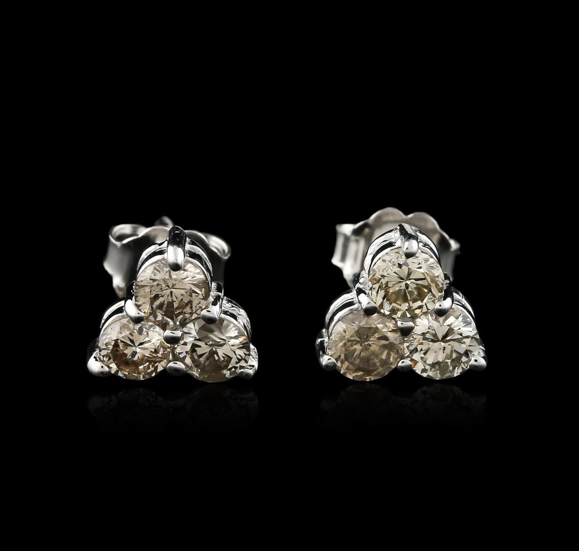One pair electronically tested 14KT white gold ladies cast diamond earrings with friction posts with a bright polish finish. Identified with markings of "585". Condition is new. Containing: Six prong set round brilliant cut diamonds, measuring 3.50 - 3.50 x 2.10mm (depth est.) approximate total weight of 6 Stones = 1.22ct. Clarity: I-1 to I-2. Color: L - M, Cut is Good. Diamonds are graded in the mounting, unless otherwise stated. Total Weight of Diamonds 1.22ct. Total Weight of Earrings 2.00 grams. GGL Appraised at $1,545.00.