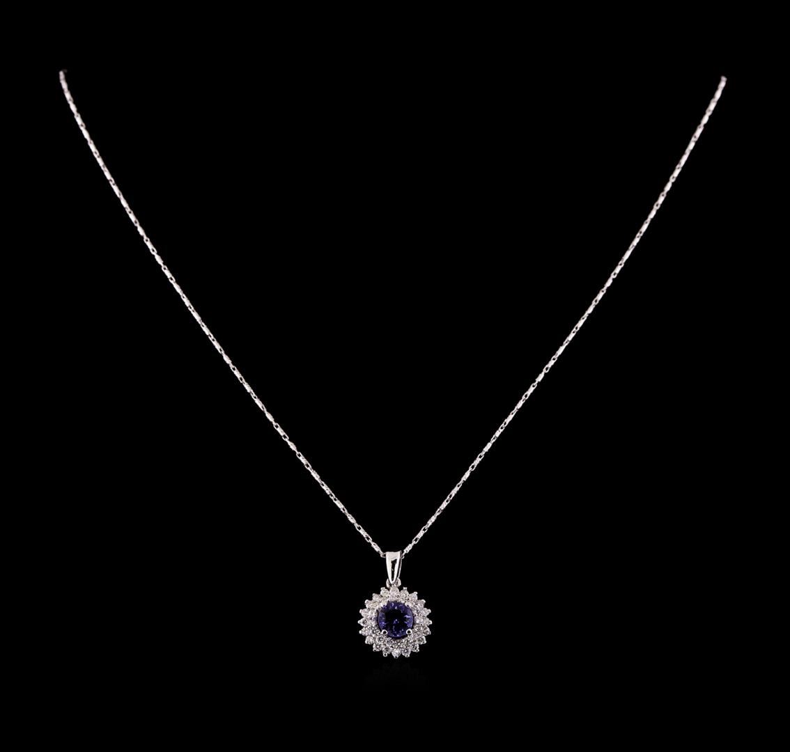 One electronically tested 14KT white gold ladies combination cast & assembled tanzanite and diamond pendant & chain 18.0" long, medium fancy link with a lobster claw clasp with a bright polish finish. Identified with markings of "585". Condition is new. Containing: One prong set round modified brilliant cut natural tanzanite, measuring 6.54 - 6.51 x 4.24 mm, approximate weight of 1.22ct., clarity is eye clean, type I, medium light, very slightly grayish, violet color, (GIA V 4/3), cut is good. Thirty-Six prong set round brilliant cut diamonds, measuring 1.80 - 1.60 x 1.02mm (depth est.) approximate total weight of 36 Stones = 0.64ct. Clarity: SI-1 to I-1. Color: I - J, Cut is Good. Colored gemstones are presumed to have been subjected to commonly used enhancement processes. All diamonds and colored gemstones are graded in the mounting, unless otherwise stated. Total Weight of Colored Stones 1.22ct. Total Weight of Diamonds 0.64ct. Total Weight of Pendant & Chain 6.20 grams. GGL Appraised.