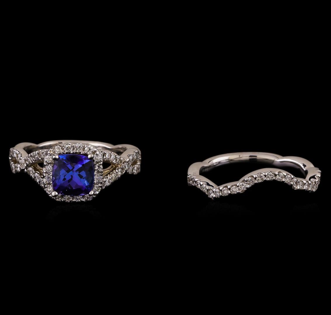 One electronically tested 14KT white gold ladies cast tanzanite and diamond ring and guard with a bright polish finish. Identified with markings of "14K". Condition is new. Containing: One prong set square cushion modified brilliant cut natural tanzanite, measuring 6.20 x 6.20 x 4.03mm, approximate weight of 1.22ct., clarity is eye clean, type I, medium light, very slightly grayish, violet color, (GIA V 4/3), cut is good. Seventy-Seven prong set round brilliant cut diamonds, measuring 1.30 - 1.30 x 0.78mm (depth est.) approximate total weight of 77 Stones = 0.62ct. Clarity: I-1 to I-2. Color: I - J, Cut is Good. Colored gemstones are presumed to have been subjected to commonly used enhancement processes. All diamonds and colored gemstones are graded in the mounting, unless otherwise stated. Total Weight of Colored Stones 1.22ct. Total Weight of Diamonds 0.62ct. Total Weight of Ring And Guard 7.40 grams. GGL Appraised.