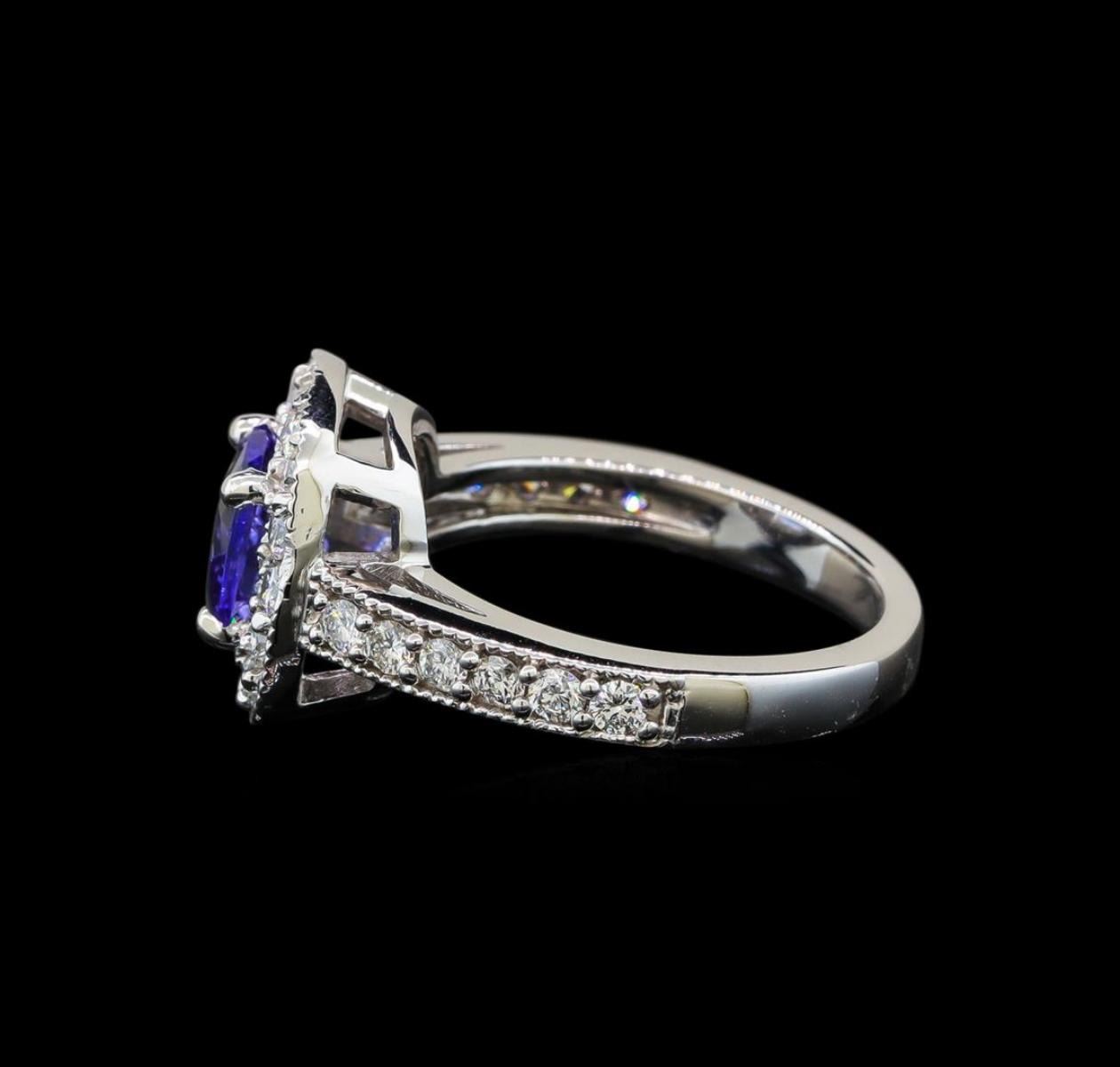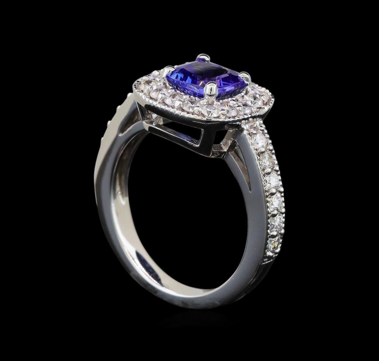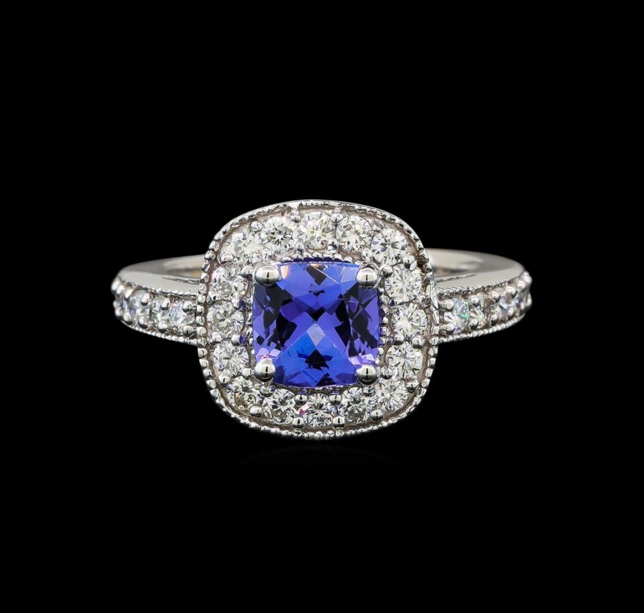 One electronically tested 14KT white gold ladies cast tanzanite and diamond ring with a bright polish finish. Identified with markings of "14K". Condition is new. Containing: One prong set square cushion modified brilliant cut natural tanzanite, measuring 6.50 x 6.50 x 4.23mm, approximate weight of 1.23ct., clarity is eye clean, type I, medium, moderately strong, violet color, (GIA V 5/4), cut is good. Twenty-Eight prong set round brilliant cut diamonds, measuring 1.60 - 1.60 x 0.96mm (depth est.) approximate total weight of 28 Stones = 0.52ct. Clarity: SI-1 to SI-2. Color: I - J, Cut is Good. Colored gemstones are presumed to have been subjected to commonly used enhancement processes. All diamonds and colored gemstones are graded in the mounting, unless otherwise stated. Total Weight of Colored Stones 1.23ct. Total Weight of Diamonds 0.52ct. Total Weight of Ring 5.80 grams. GGL Appraised.