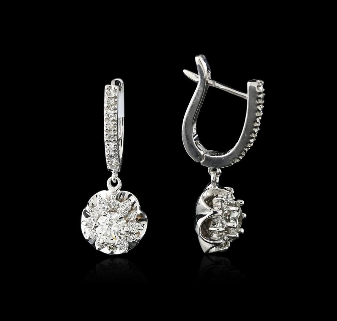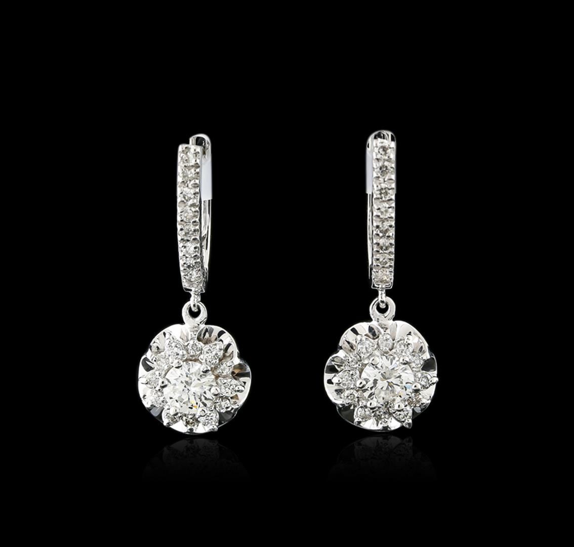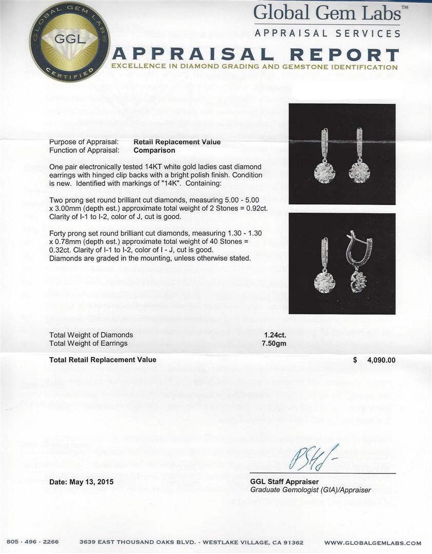 One pair electronically tested 14KT white gold ladies cast diamond earrings with hinged clip backs with a bright polish finish. Identified with markings of "14K". Condition is new. Containing: Two prong set round brilliant cut diamonds, measuring 5.00 - 5.00 x 3.00mm (depth est.) approximate total weight of 2 Stones = 0.92ct. Clarity: I-1 to I-2. Color: J, Cut is Good. Forty prong set round brilliant cut diamonds, measuring 1.30 - 1.30 x 0.78mm (depth est.) approximate total weight of 40 Stones = 0.32ct. Clarity: I-1 to I-2. Color: I - J, Cut is Good. Diamonds are graded in the mounting, unless otherwise stated. Total Weight of Diamonds 1.24ct. Total Weight of Earrings 7.50 grams. GGL Appraised at $4,090.00.