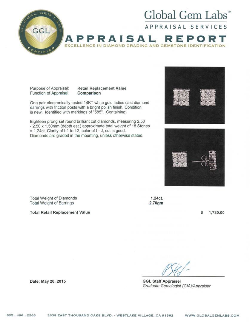 One pair electronically tested 14KT white gold ladies cast diamond earrings with friction posts with a bright polish finish. Identified with markings of "585". Condition is new. Containing: Eighteen prong set round brilliant cut diamonds, measuring 2.50 - 2.50 x 1.50mm (depth est.) approximate total weight of 18 Stones = 1.24ct. Clarity: I-1 to I-2. Color: I - J, Cut is Good. Diamonds are graded in the mounting, unless otherwise stated. Total Weight of Diamonds 1.24ct. Total Weight of Earrings 2.70 grams. GGL Appraised at $1,730.00.