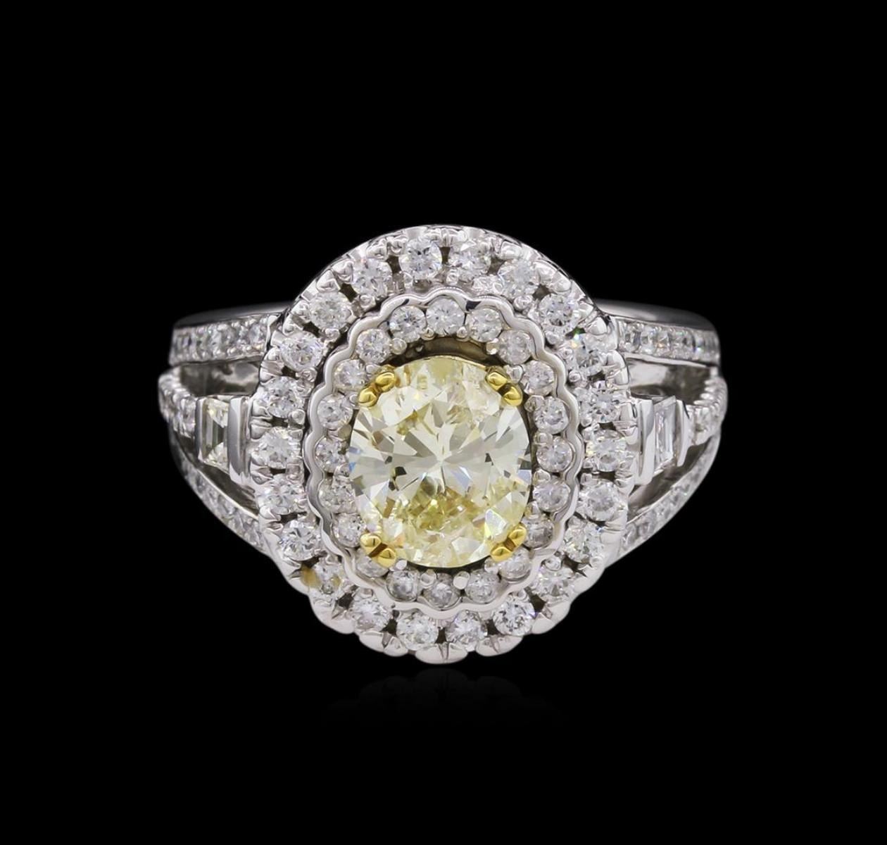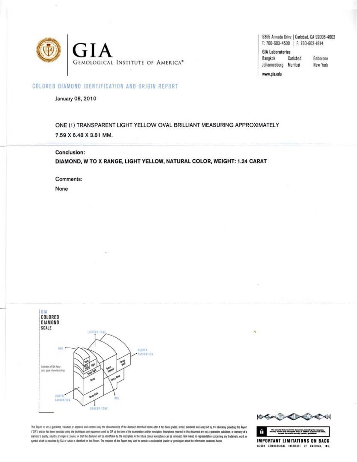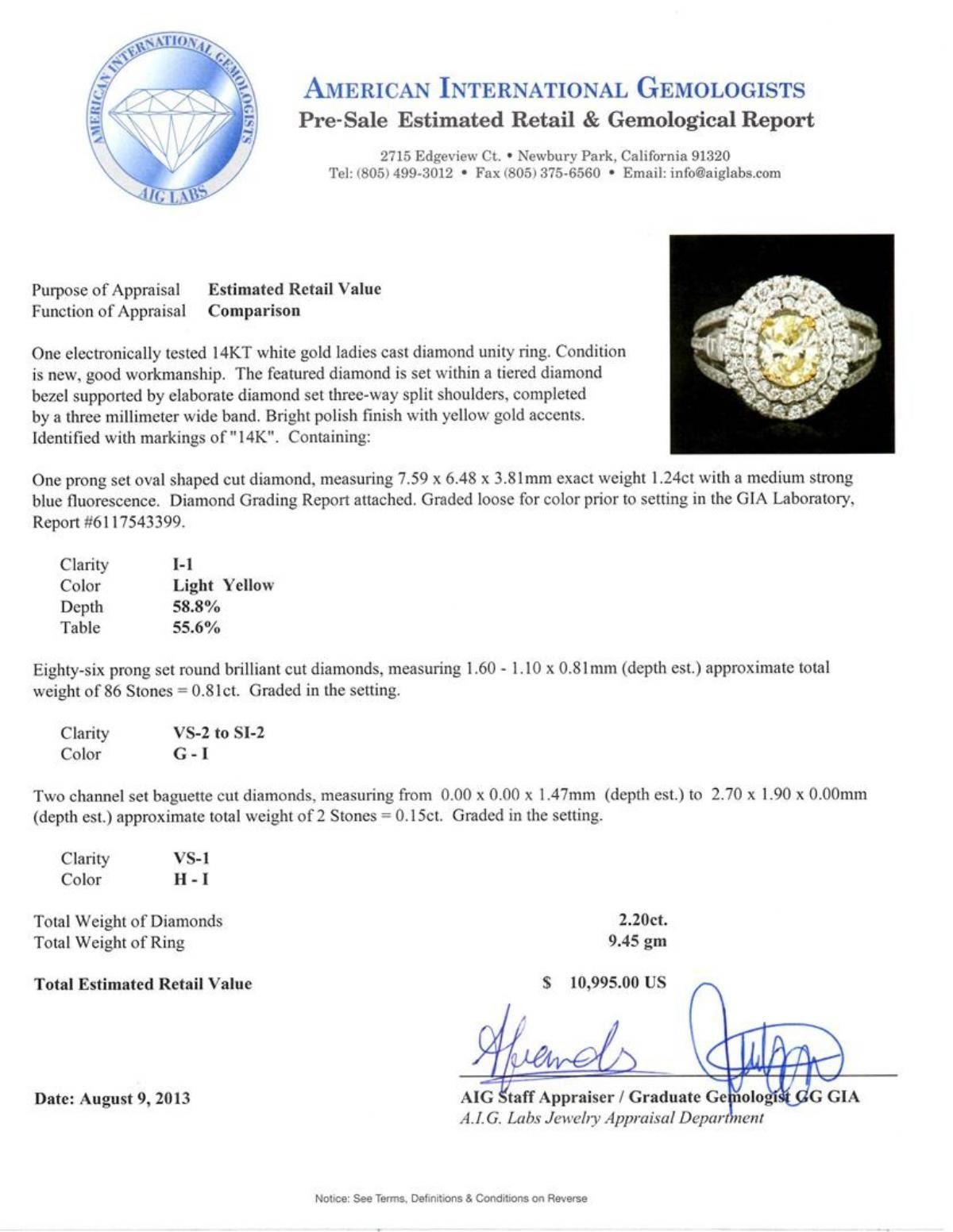 14KT White Gold 1.24ct I-1/Light Yellow GIA Cert Diamond Ring. Great Condition! YM1055RF. One electronically tested 14KT white gold ladies cast diamond unity ring. Condition is new, good workmanship. The featured diamond is set within a tiered diamond bezel supported by elaborate diamond set three-way split shoulders, completed by a three millimeter wide band. Bright polish finish with yellow gold accents. Identified with markings of "14K". Containing: One prong set oval shaped cut diamond, measuring 7.59 x 6.48 x 3.81mm exact weight 1.24ct with a medium strong blue fluorescence. Diamond Grading Report attached. Graded loose for color prior to setting in the GIA Laboratory, Report #6117543399. Clarity I-1. Color Light Yellow. Depth 58.8%. Table 55.6%. Eighty-six prong set round brilliant cut diamonds, measuring 1.60 - 1.10 x 0.81mm (depth est.) approximate total weight of 86 Stones = 0.81ct. Graded in the setting. Clarity VS-2 to SI - 2. Color G - I Two channel set baguette cut diamonds, measuring from 0.00 x 0.00 x 1.47mm (depth est.) to 2.70 x 1.90 x 0.00mm (depth est.) approximate total weight of 2 Stones = 0.15ct. Graded in the setting. Clarity VS-1. Color H - I. Total weight of Diamond 2.20ct. Total weight of Ring 9.45gm. AIG Appraised at $10,995.00.