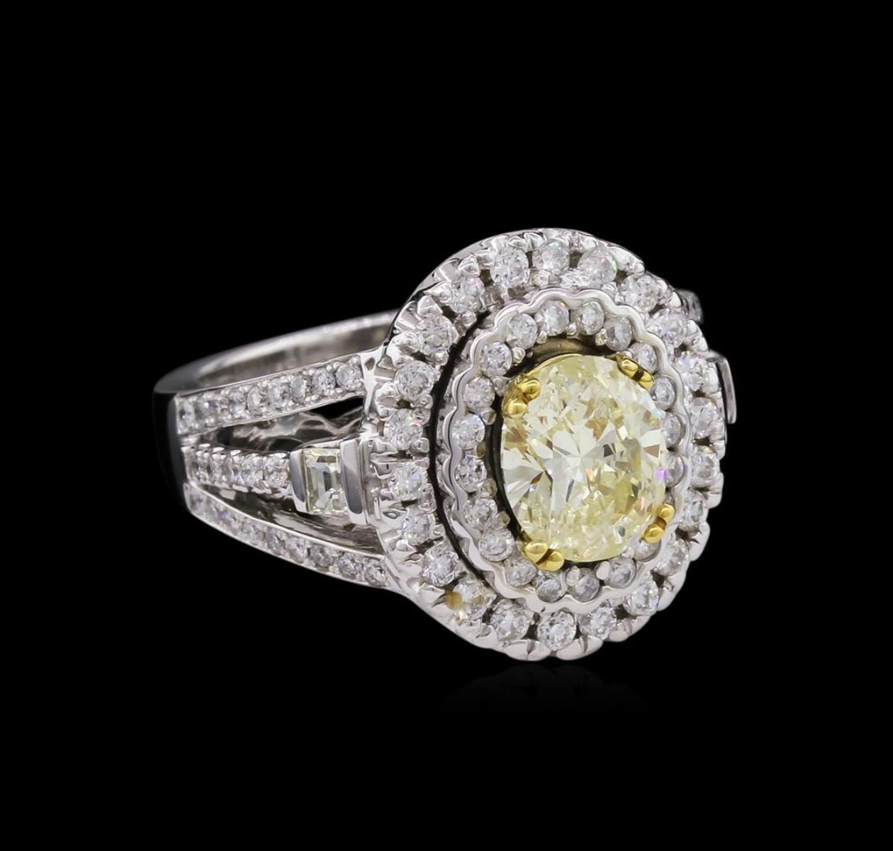 14KT White Gold 1.24ct I-1/Light Yellow GIA Cert Diamond Ring. Great Condition! YM1055RF. One electronically tested 14KT white gold ladies cast diamond unity ring. Condition is new, good workmanship. The featured diamond is set within a tiered diamond bezel supported by elaborate diamond set three-way split shoulders, completed by a three millimeter wide band. Bright polish finish with yellow gold accents. Identified with markings of "14K". Containing: One prong set oval shaped cut diamond, measuring 7.59 x 6.48 x 3.81mm exact weight 1.24ct with a medium strong blue fluorescence. Diamond Grading Report attached. Graded loose for color prior to setting in the GIA Laboratory, Report #6117543399. Clarity I-1. Color Light Yellow. Depth 58.8%. Table 55.6%. Eighty-six prong set round brilliant cut diamonds, measuring 1.60 - 1.10 x 0.81mm (depth est.) approximate total weight of 86 Stones = 0.81ct. Graded in the setting. Clarity VS-2 to SI - 2. Color G - I Two channel set baguette cut diamonds, measuring from 0.00 x 0.00 x 1.47mm (depth est.) to 2.70 x 1.90 x 0.00mm (depth est.) approximate total weight of 2 Stones = 0.15ct. Graded in the setting. Clarity VS-1. Color H - I. Total weight of Diamond 2.20ct. Total weight of Ring 9.45gm. AIG Appraised at $10,995.00.