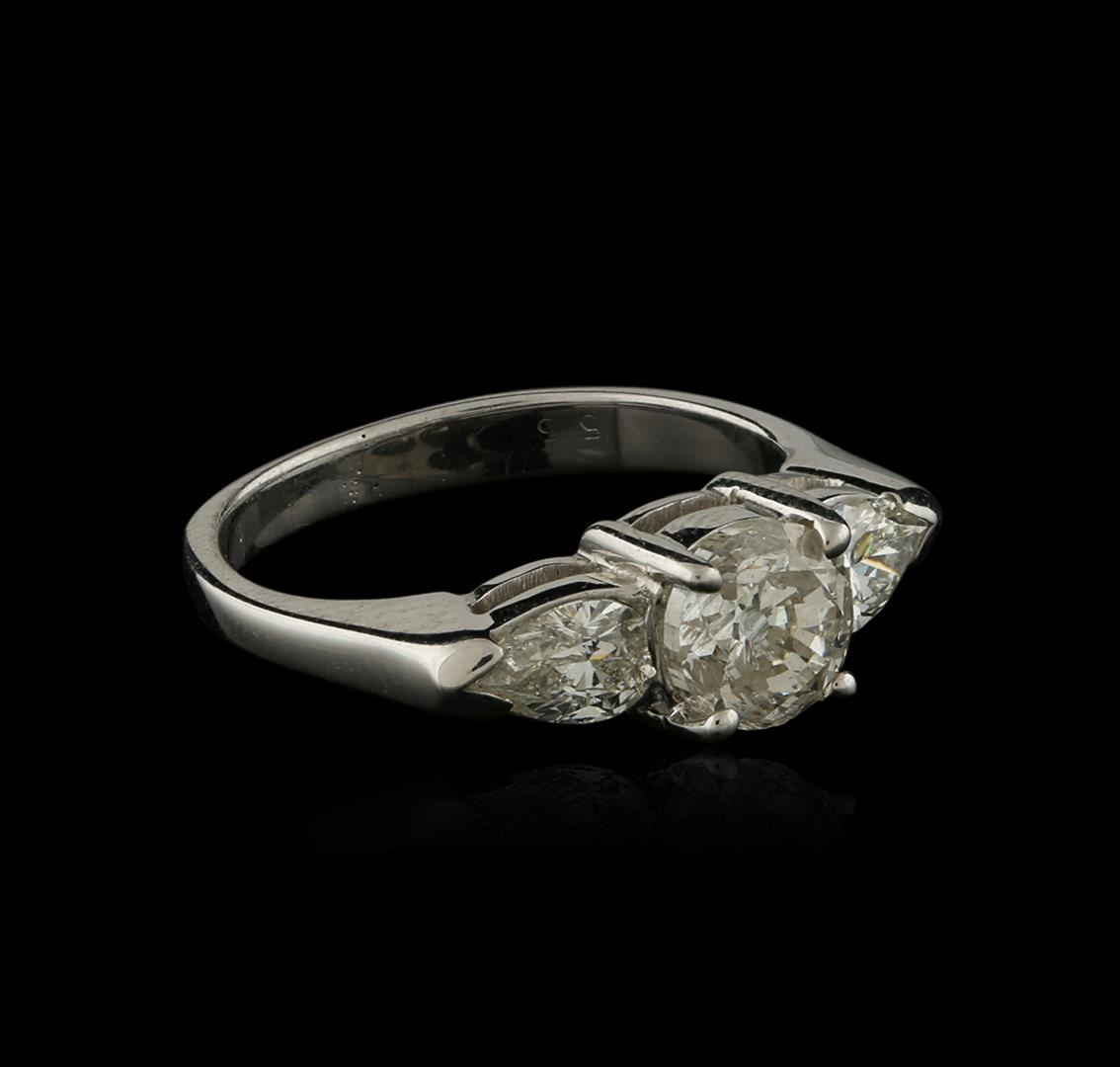 One electronically tested 14KT white gold ladies cast diamond engagement ring with a bright polish finish. Identified with markings of "14K". Condition is very good. Containing: One prong set round brilliant cut diamond, measuring 5.80 - 5.80 x 3.48mm (depth est.) approximate weight of 0.71ct. Clarity: I-2. Color: J. Two prong set pear shaped cut diamonds, measuring 5.00 x 3.50 x 2.55mm (depth est.) approximate total weight of 2 Stones = 0.54ct. Clarity: SI-1. Color: J, Cut is Good. All diamonds are graded in the mounting, unless otherwise stated. Total Weight of Diamonds 1.25ct. Total Weight of Engagement Ring 3.70 grams. GGL Appraised.