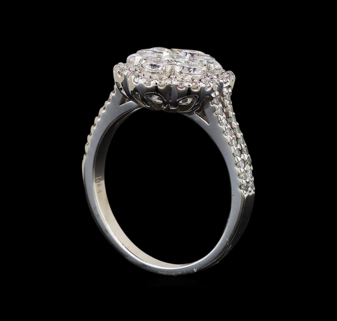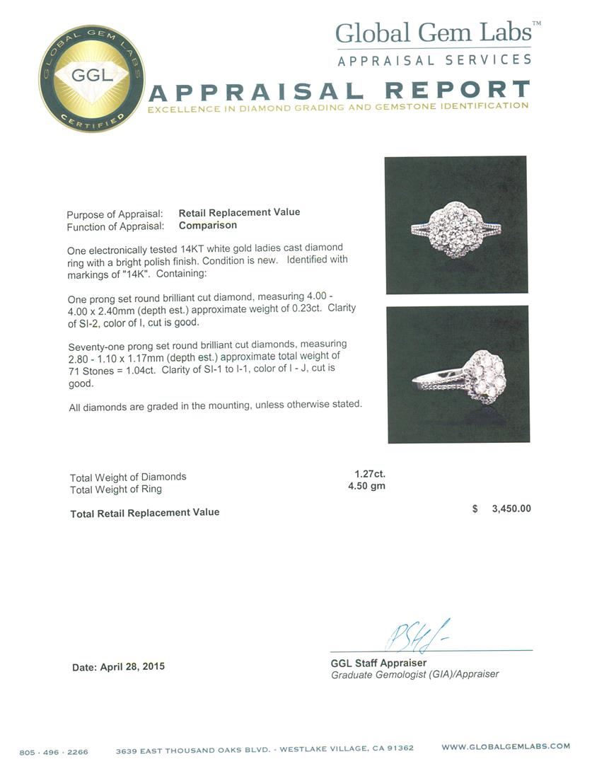One electronically tested 14KT white gold ladies cast diamond ring with a bright polish finish. Identified with markings of "14K". Condition is new. Containing: One prong set round brilliant cut diamond, measuring 4.00 - 4.00 x 2.40mm (depth est.) approximate weight of 0.23ct. Clarity: SI-2. Color: I, Cut is Good. Seventy-One prong set round brilliant cut diamonds, measuring 2.80 - 1.10 x 1.17mm (depth est.) approximate total weight of 71 Stones = 1.04ct. Clarity: SI-1 to I-1. Color: I - J, Cut is Good. All diamonds are graded in the mounting, unless otherwise stated. Total Weight of Diamonds 1.27ct. Total Weight of Ring 4.50 grams. GGL Appraised.