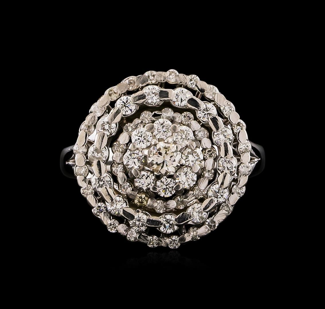 One electronically tested 14KT white gold ladies cast diamond ring with a bright polish finish. The ring features a multi-tier diamond cluster, completed by a two and one-half millimeter wide band. Identified with markings of "K14". Condition is new, good workmanship. Containing: One prong set round brilliant cut diamond, measuring 3.40 - 3.35 x 2.03mm (depth est.) approximate weight of 0.15ct. Graded in the setting. Clarity: SI-2. Color: J Twenty-Two prong set round brilliant cut diamonds, measuring 2.00 - 1.90 x 1.17mm (depth est.) approximate total weight of 22 Stones = 0.69ct. Graded in the setting. Clarity: SI-1 to SI-2. Color: G - I Thirty-Eight prong set round brilliant cut diamonds, measuring 1.40 - 1.30 x 0.81mm (depth est.) approximate total weight of 38 Stones = 0.44ct. Graded in the setting. Clarity: SI-1 to I-1. Color: H - J. Total Weight of Diamonds 1.28ct. Total Weight of Ring 7.46 grams. AIG Appraised at $5,425.00.