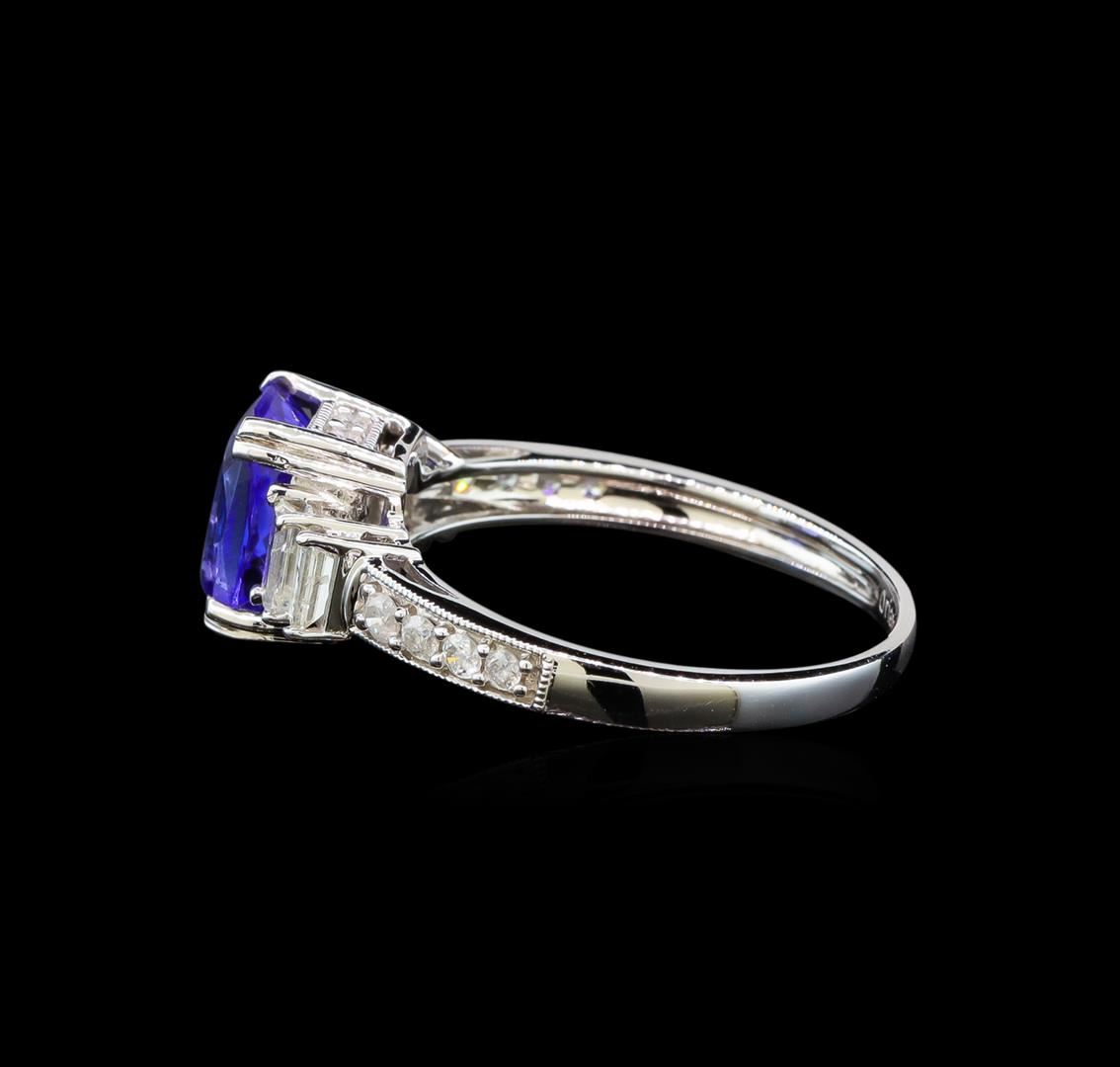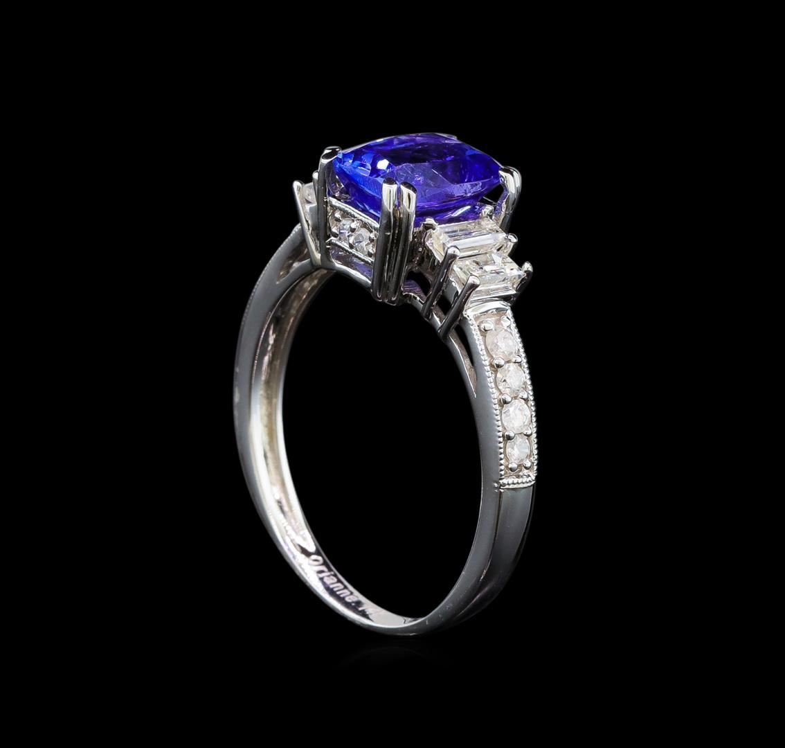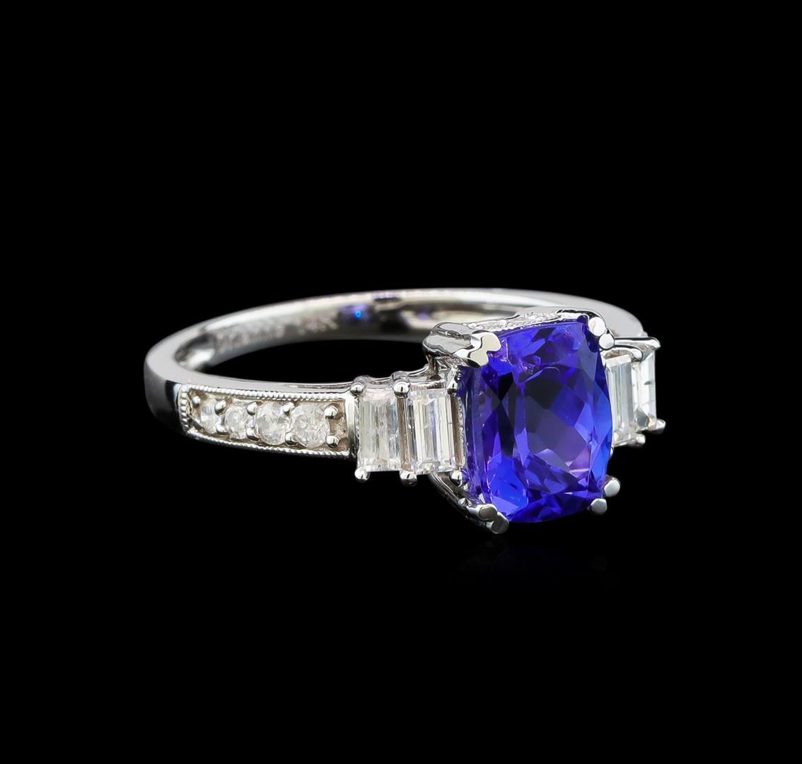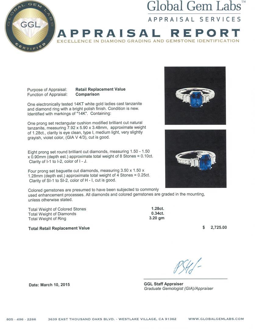 One electronically tested 14KT white gold ladies cast tanzanite and diamond ring with a bright polish finish. Identified with markings of "14K". Condition is new. Containing: One prong set rectangular cushion modified brilliant cut natural tanzanite, measuring 7.92 x 5.90 x 3.48mm, approximate weight of 1.28ct., clarity is eye clean, type I, medium light, very slightly grayish, violet color, (GIA V 4/3), cut is good. Eight prong set round brilliant cut diamonds, measuring 1.50 - 1.50 x 0.90mm (depth est.) approximate total weight of 8 Stones = 0.10 ct. Clarity: I-1 to I-2. Color: I - J. Four prong set baguette cut diamonds, measuring 3.50 x 1.50 x 1.28mm (depth est.) approximate total weight of 4 Stones = 0.25ct. Clarity: SI-1 to SI-2. Color: H - I, Cut is Good. Colored gemstones are presumed to have been subjected to commonly used enhancement processes. All diamonds and colored gemstones are graded in the mounting, unless otherwise stated. Total Weight of Colored Stones 1.28ct. Total Weight of Diamonds 0.34ct. Total Weight of Ring 3.20 grams. GGL Appraised.