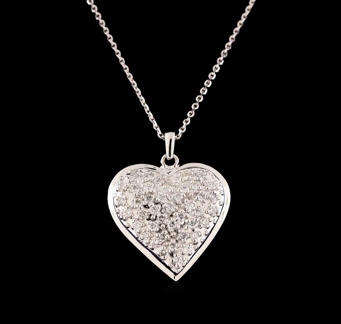 One electronically tested 14KT white gold ladies cast diamond pendant & chain 18.3" long, cable link with a lobster claw clasp with a bright polish finish. Identified with markings of "14K". Condition is new. Containing: Forty-Four prong set round brilliant cut diamonds, measuring 2.00 - 2.00 x 1.20mm (depth est.) approximate total weight of 44 Stones = 1.29ct. Clarity: SI-2 to I-1. Color: J - K, Cut is Good. All diamonds are graded in the mounting, unless otherwise stated. Total Weight of Diamonds 1.29ct. Total Weight of Pendant & Chain 13.60 grams. GGL Appraised.