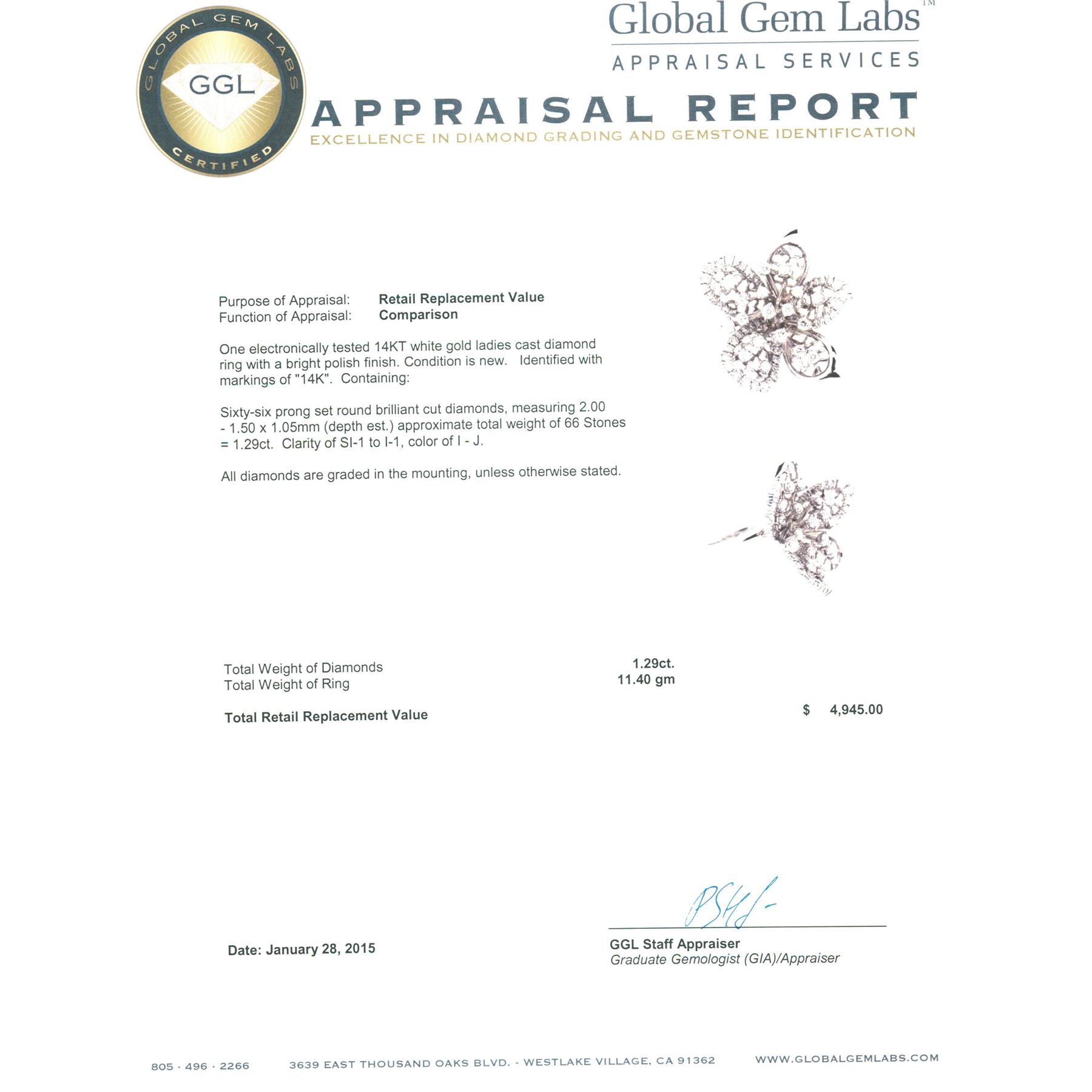 One electronically tested 14KT white gold ladies cast diamond ring with a bright polish finish. Identified with markings of "14K". Condition is new. Containing: Sixty-Six prong set round brilliant cut diamonds, measuring 2.00 - 1.50 x 1.05mm (depth est.) approximate total weight of 66 Stones = 1.29ct. Clarity: SI-1 to I-1. Color: I - J. All diamonds are graded in the mounting, unless otherwise stated. Total Weight of Diamonds 1.29ct. Total Weight of Ring 11.40 grams. GGL Appraised.