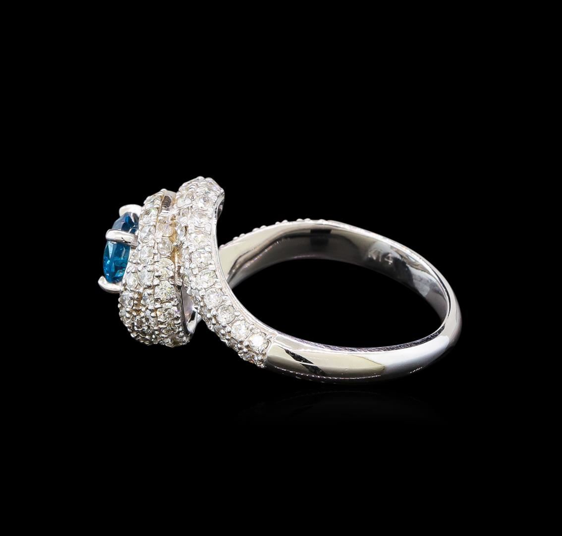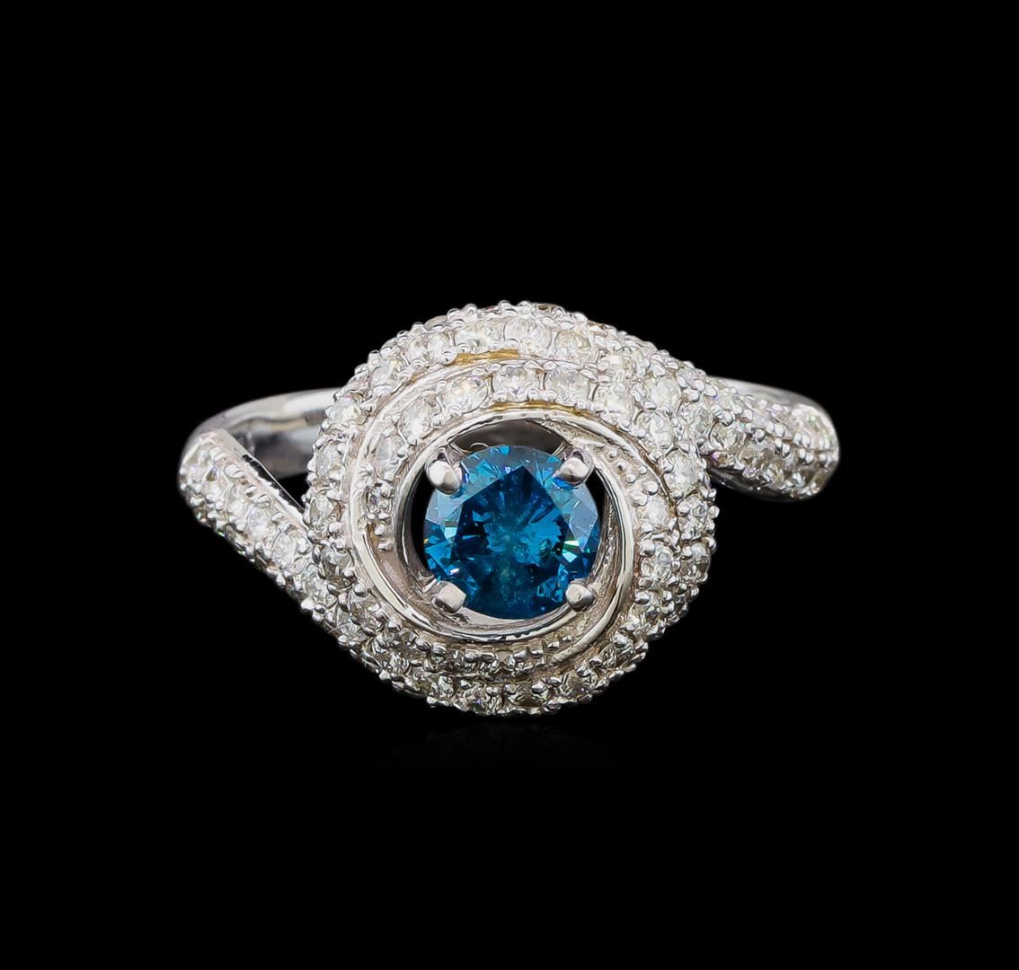 One electronically tested 14KT white gold ladies cast diamond engagement ring with a bright polish finish. Identified with markings of "14K". Condition is new. Containing: One prong set round brilliant cut diamond, measuring 5.34 - 5.34 x 3.20mm (depth est.) approximate weight of 0.56ct. Clarity: I-2, Cut is Good. The color of the stone has been treated. Ninety-One prong set round brilliant cut diamonds, measuring 1.30 - 1.30 x 0.78mm (depth est.) approximate total weight of 91 Stones = 0.73ct. Clarity: SI-2 to I-2. Color: H - I, Cut is Good. All diamonds are graded in the mounting, unless otherwise stated. Total Weight of Diamonds 1.29ct. Total Weight of Engagement Ring 5.20 grams. GGL Appraised.